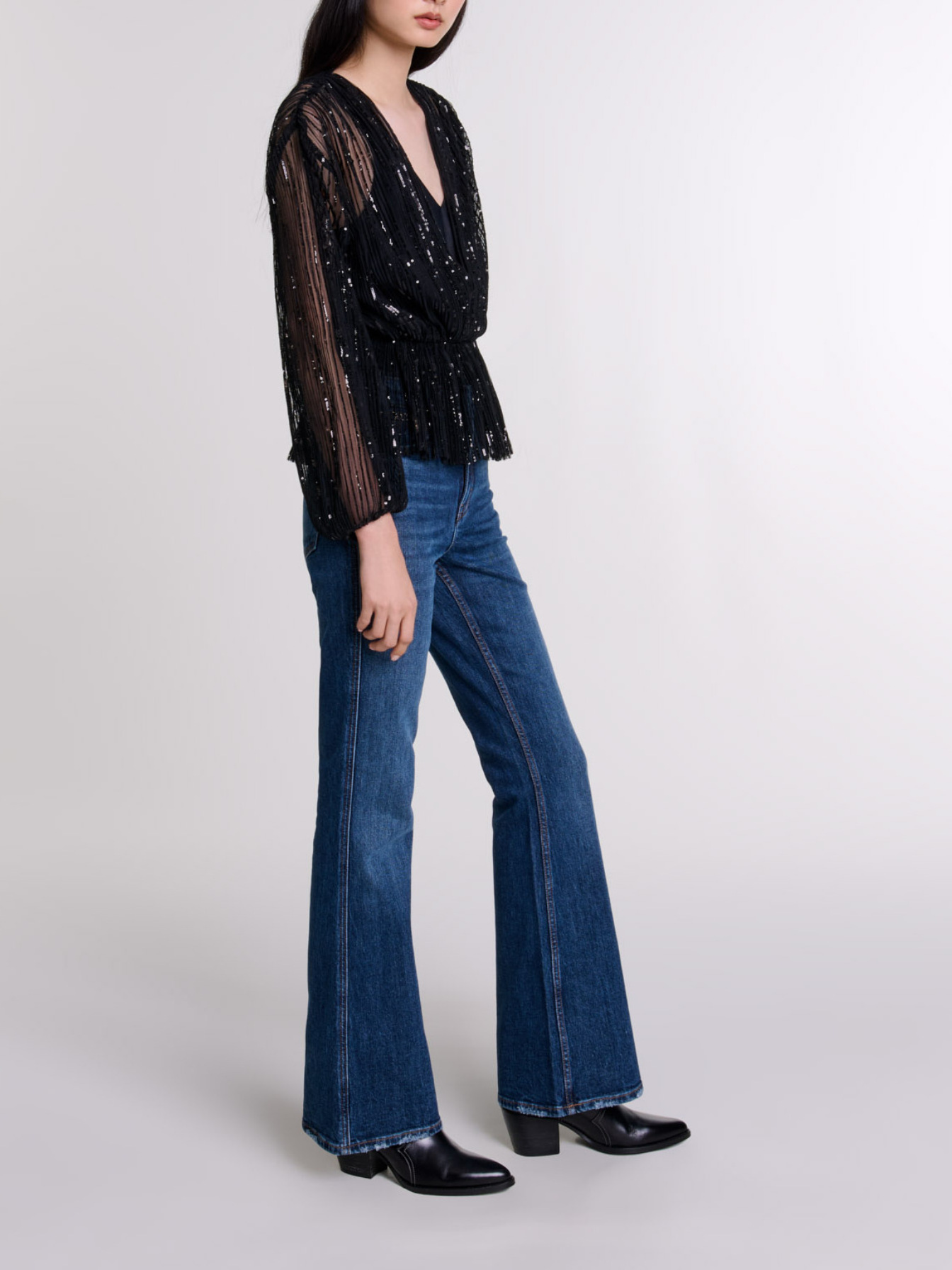 This versatile top features all-over sequins and sheer detailing.