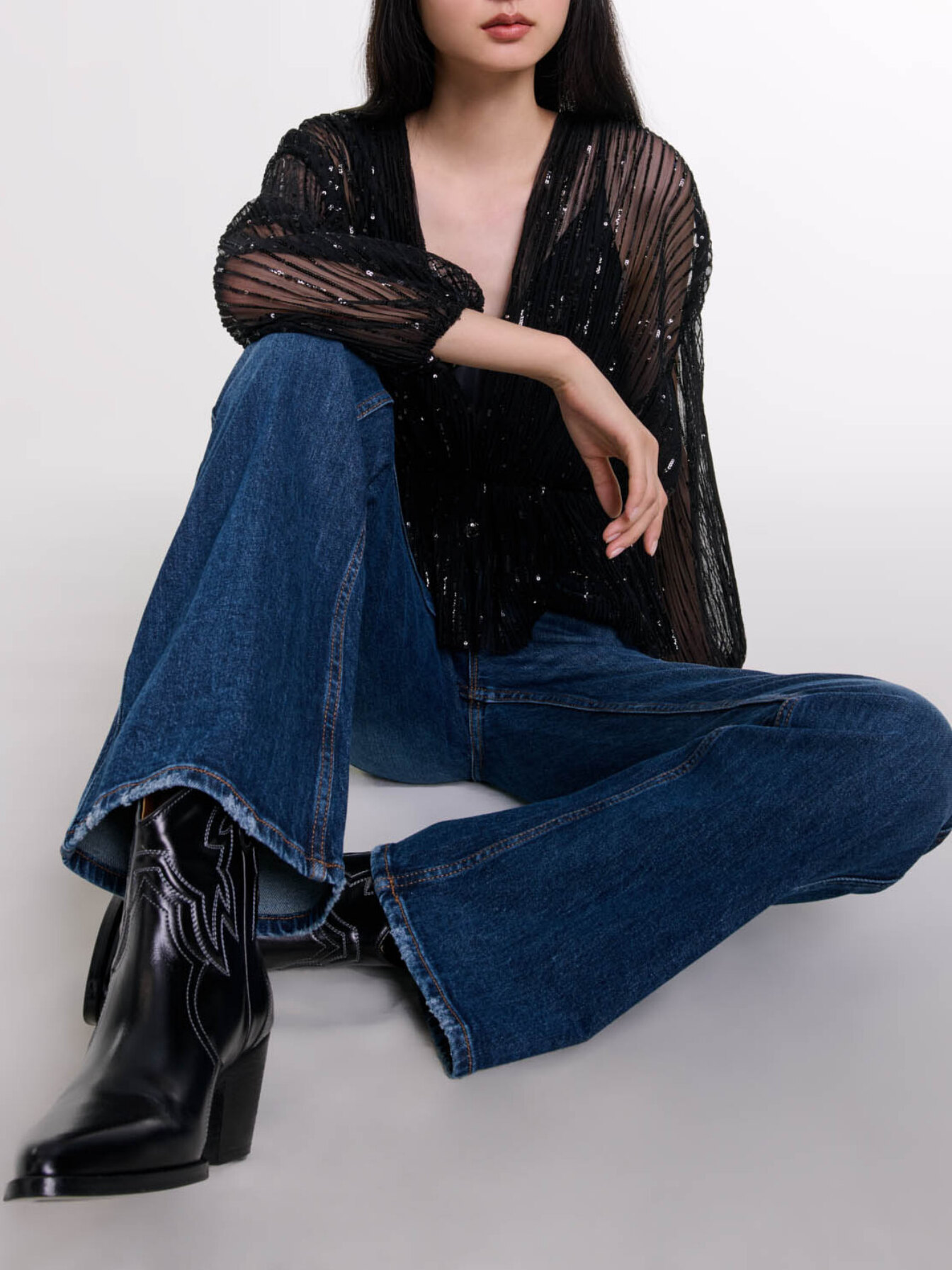 Semi-sheer top Sequins Plunging V-neck Removable satin-effect top with spaghetti straps Elasticated waist creating a basque Long sleeves with gathered cuffs.