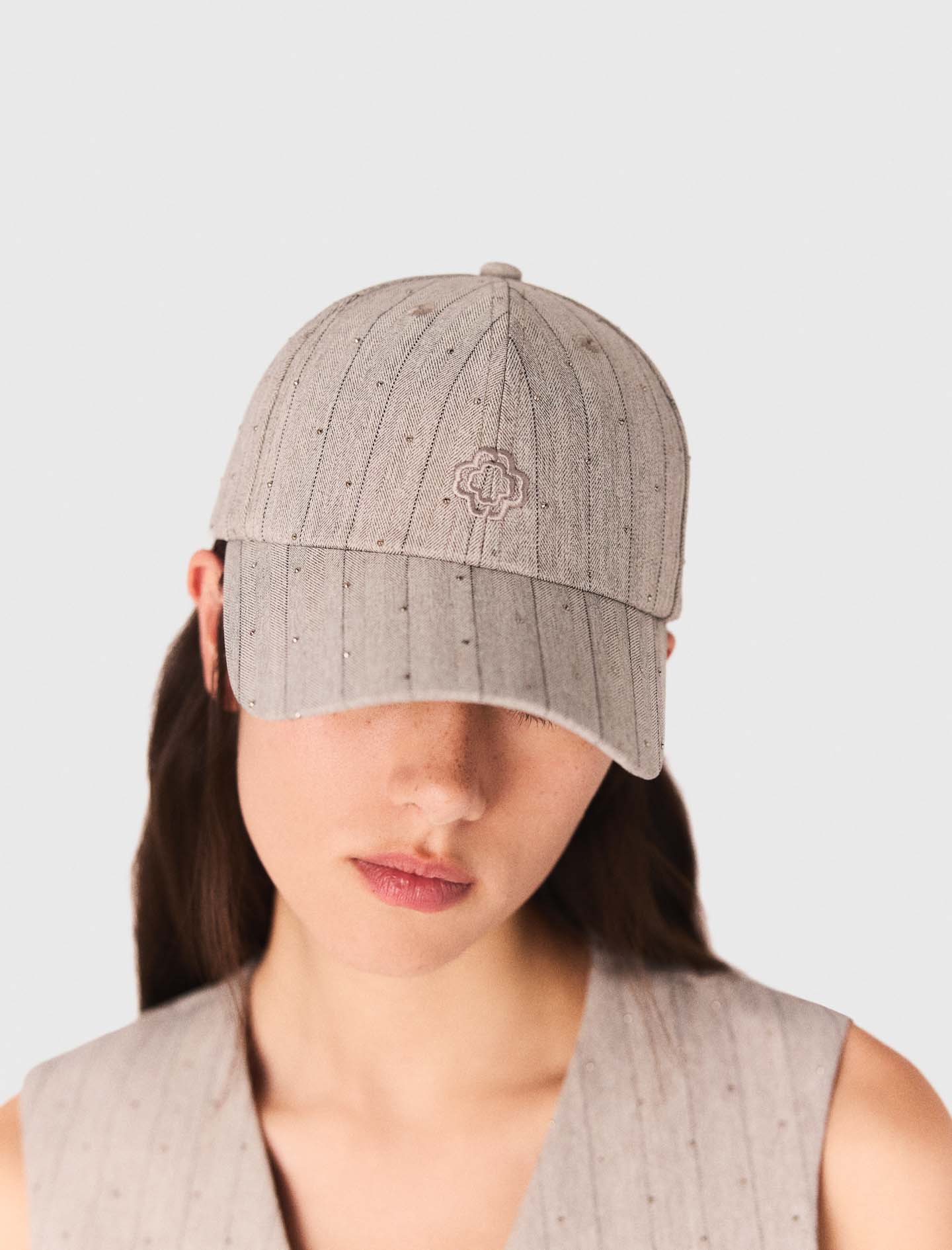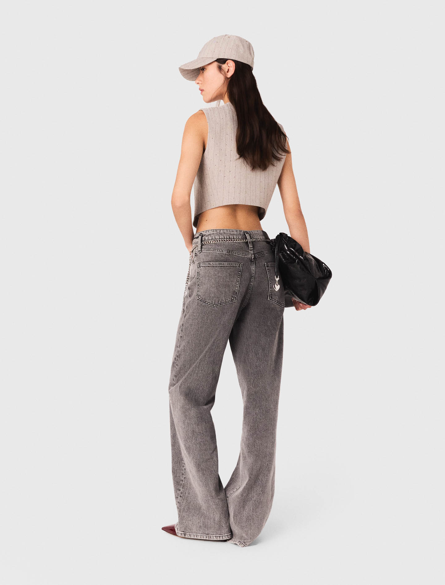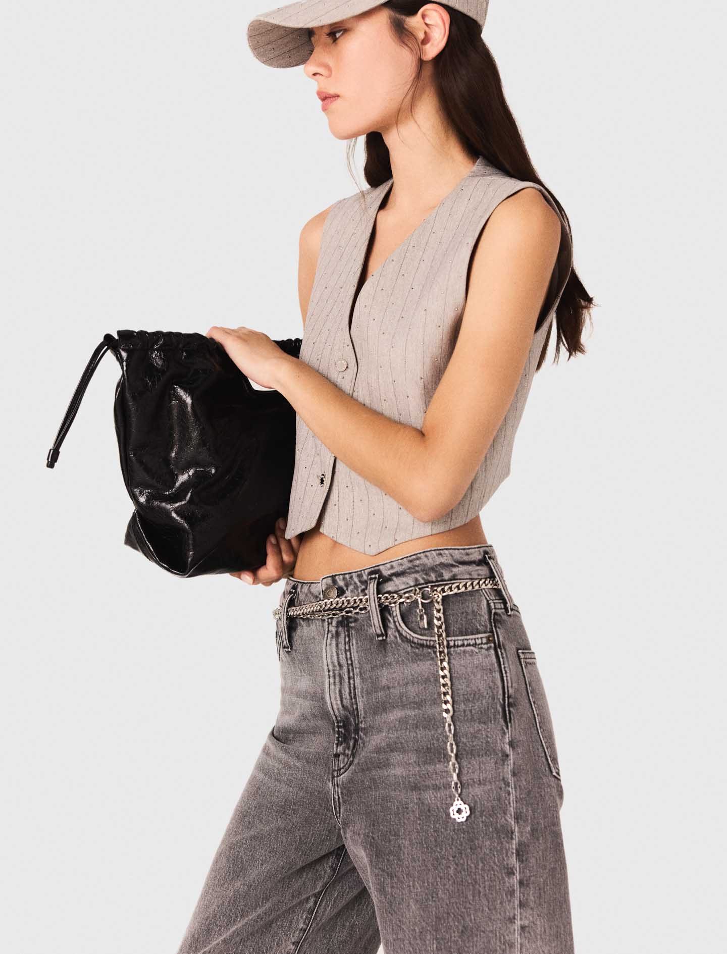 Play on contrasts with faded jeans, a jewellery belt and the matching cap..
