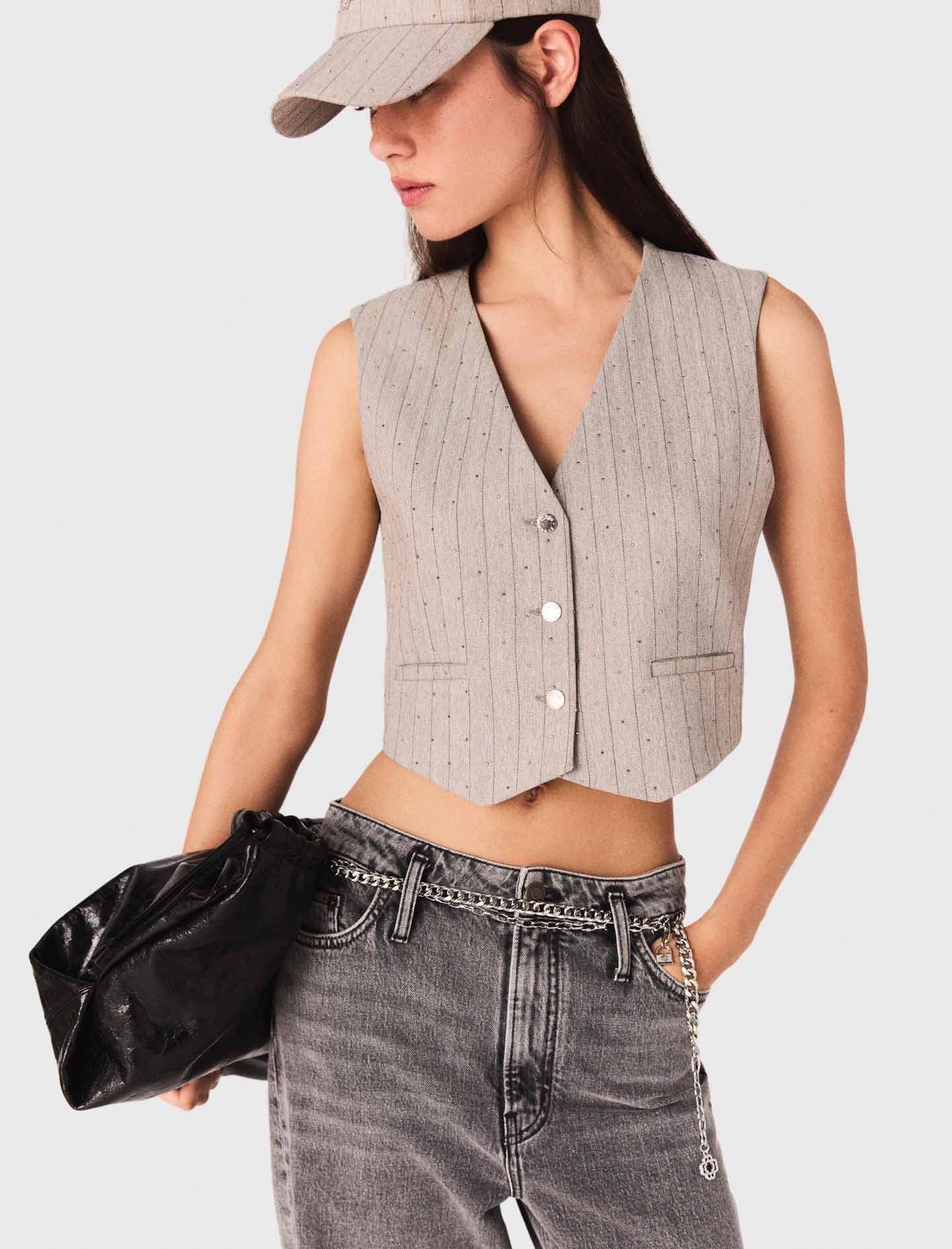 The tailored vest is reinvented this season with stripes of sparkling rhinestones.
