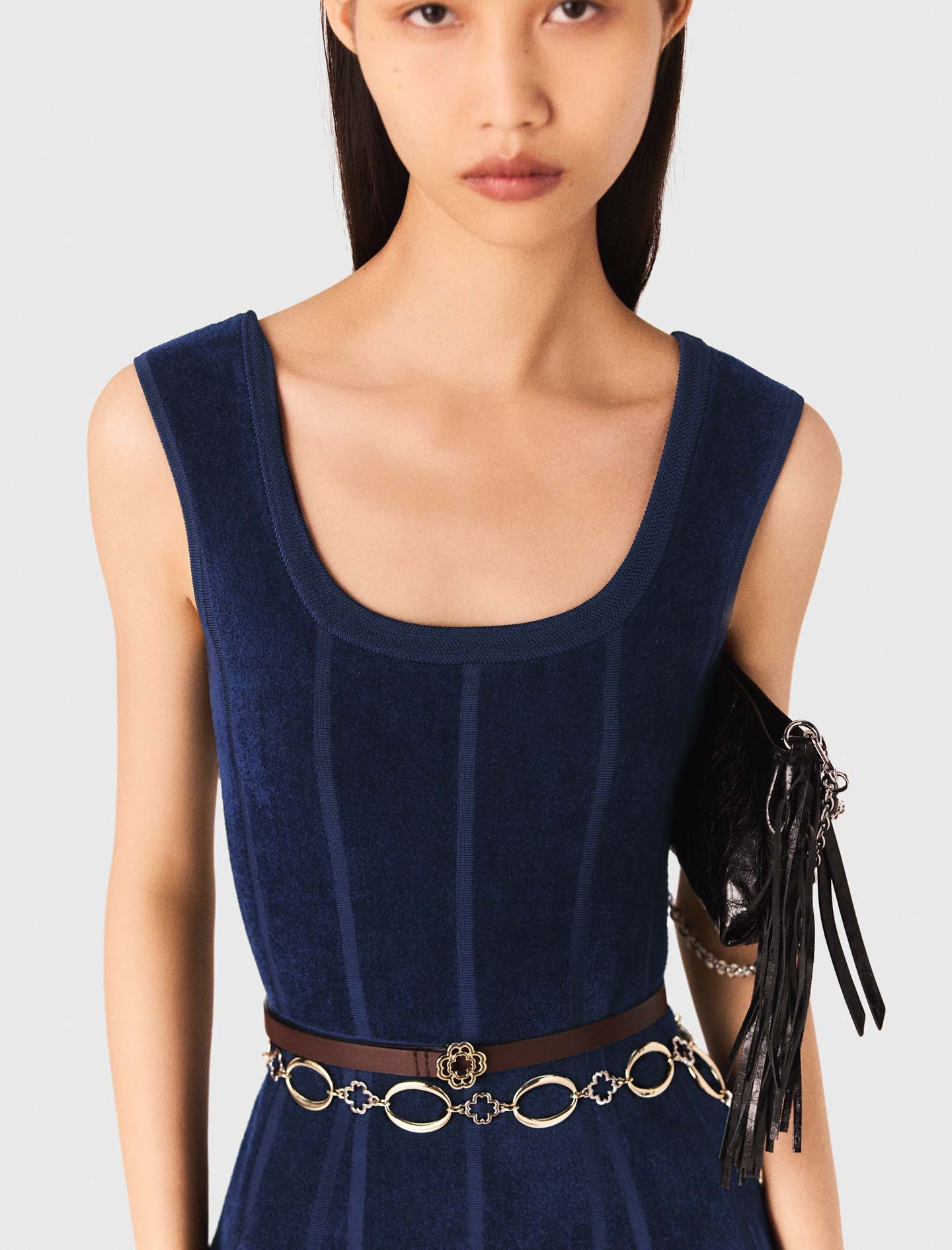 Maje viscose Flared velvet knit midi dress Round neck and wide straps Flared skirt Designed for a standard fit This dress fully embodies the Maje look: