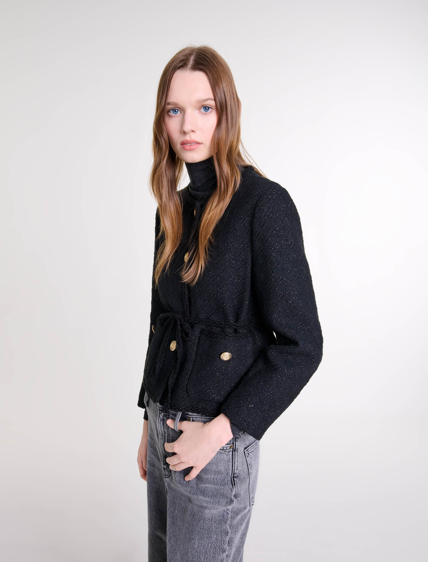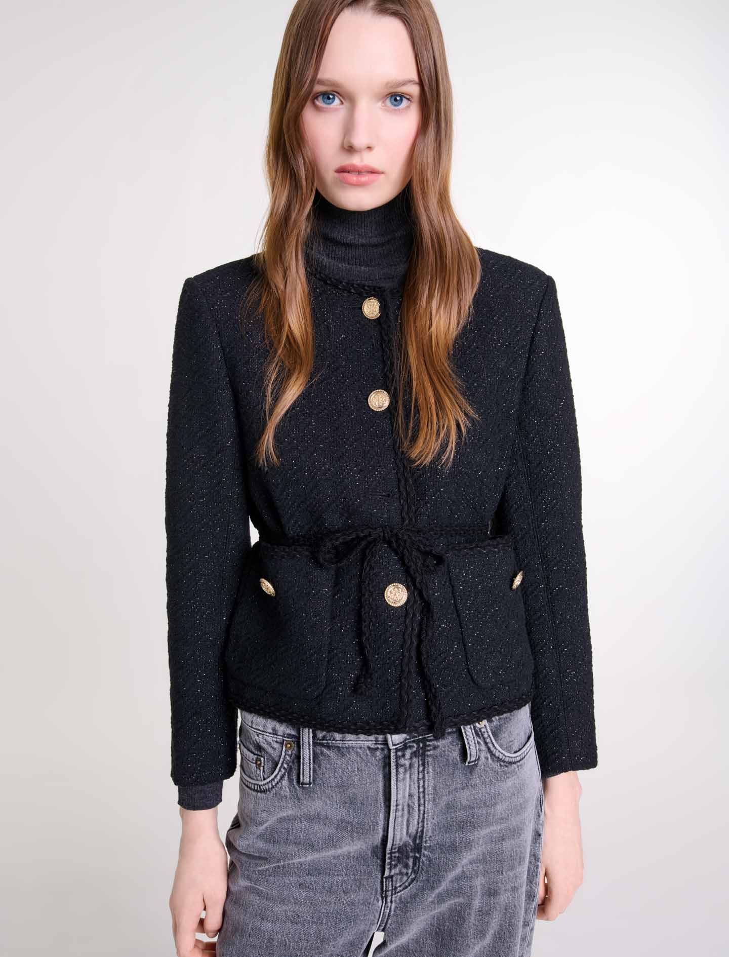 Maje Woman's cotton Belted shiny tweed jacket for Spring/Summer, in color Black / Black
