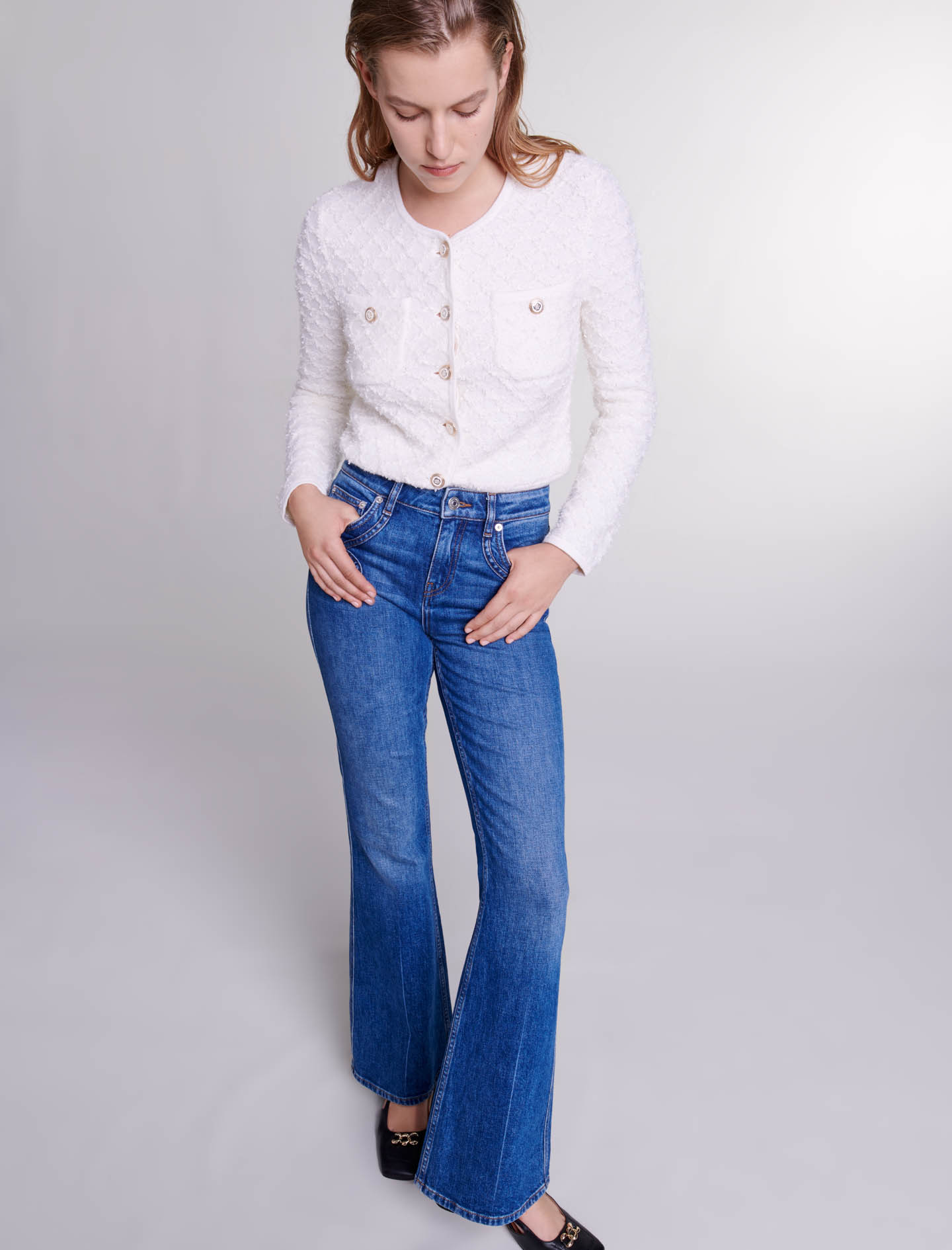 Maje cotton These faded denim jeans have a flared cut and a mid-rise waist.