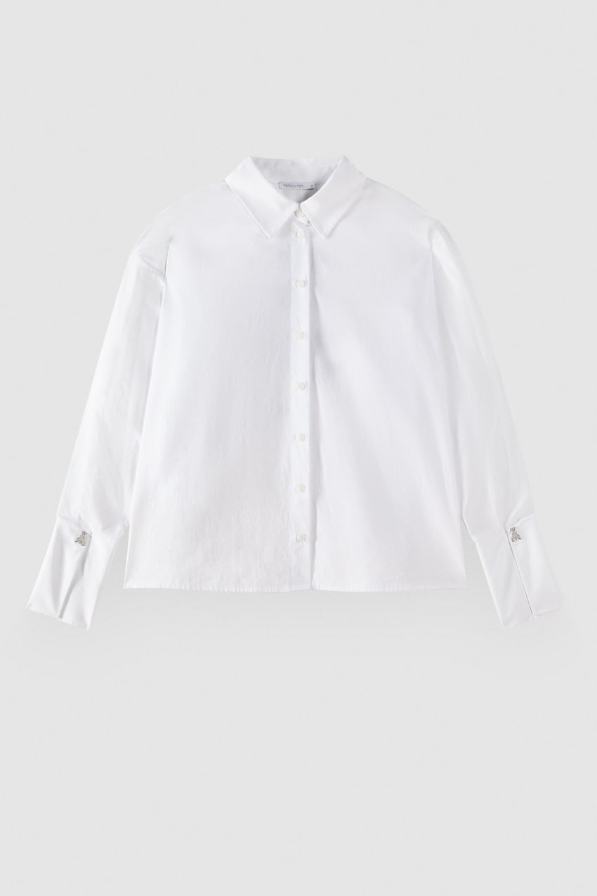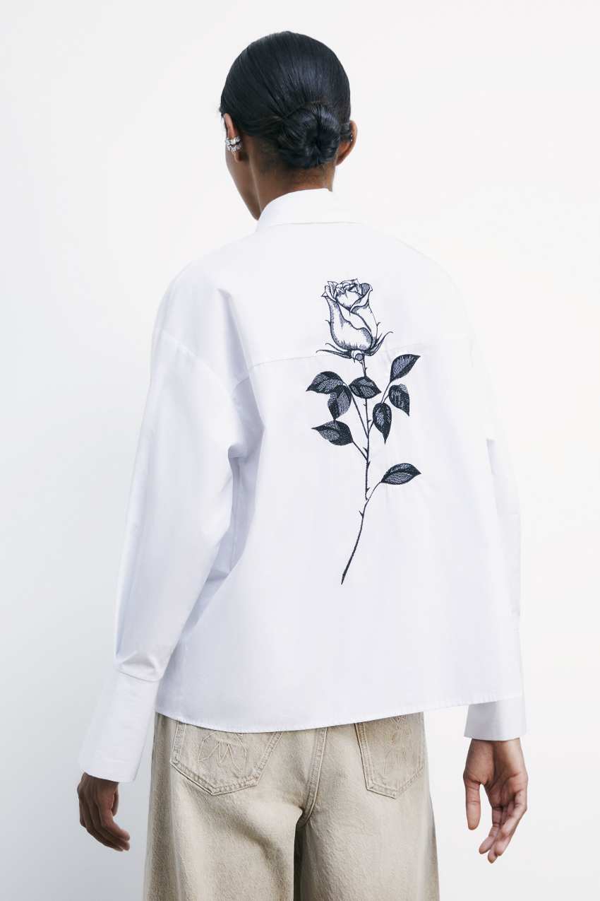 La camicia in cotone della capsule Back to Office viene reinterpretata in chiave Patrizia Pepe con un fit oversize e il ricamo Radical Rose sulla schiena.