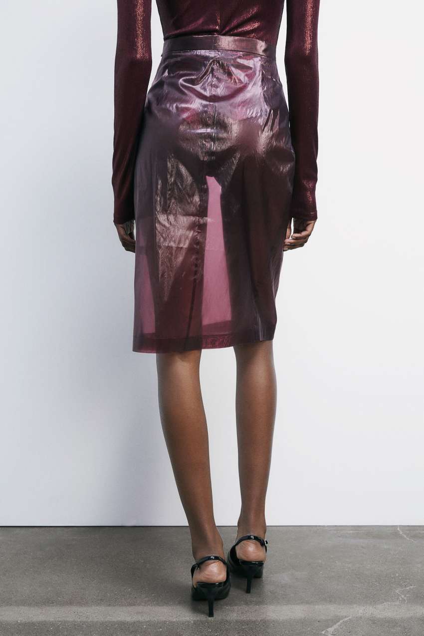 Le trasparenze e le leggerezze tipiche di Patrizia Pepe prendono forma in una gonna midi in organza watery.