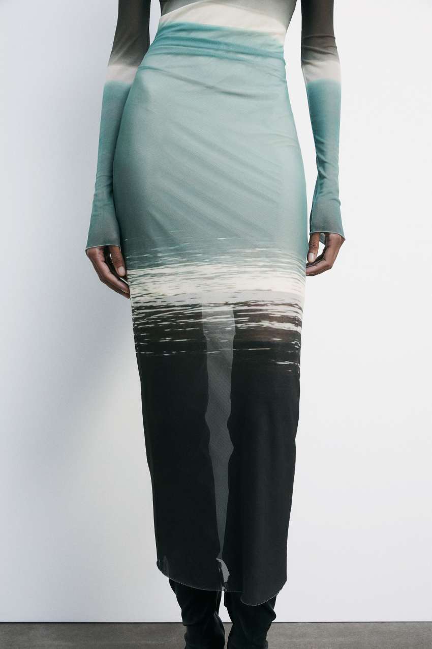 La stampa grafica disegna sfumature fluide in tonalità acquatiche.