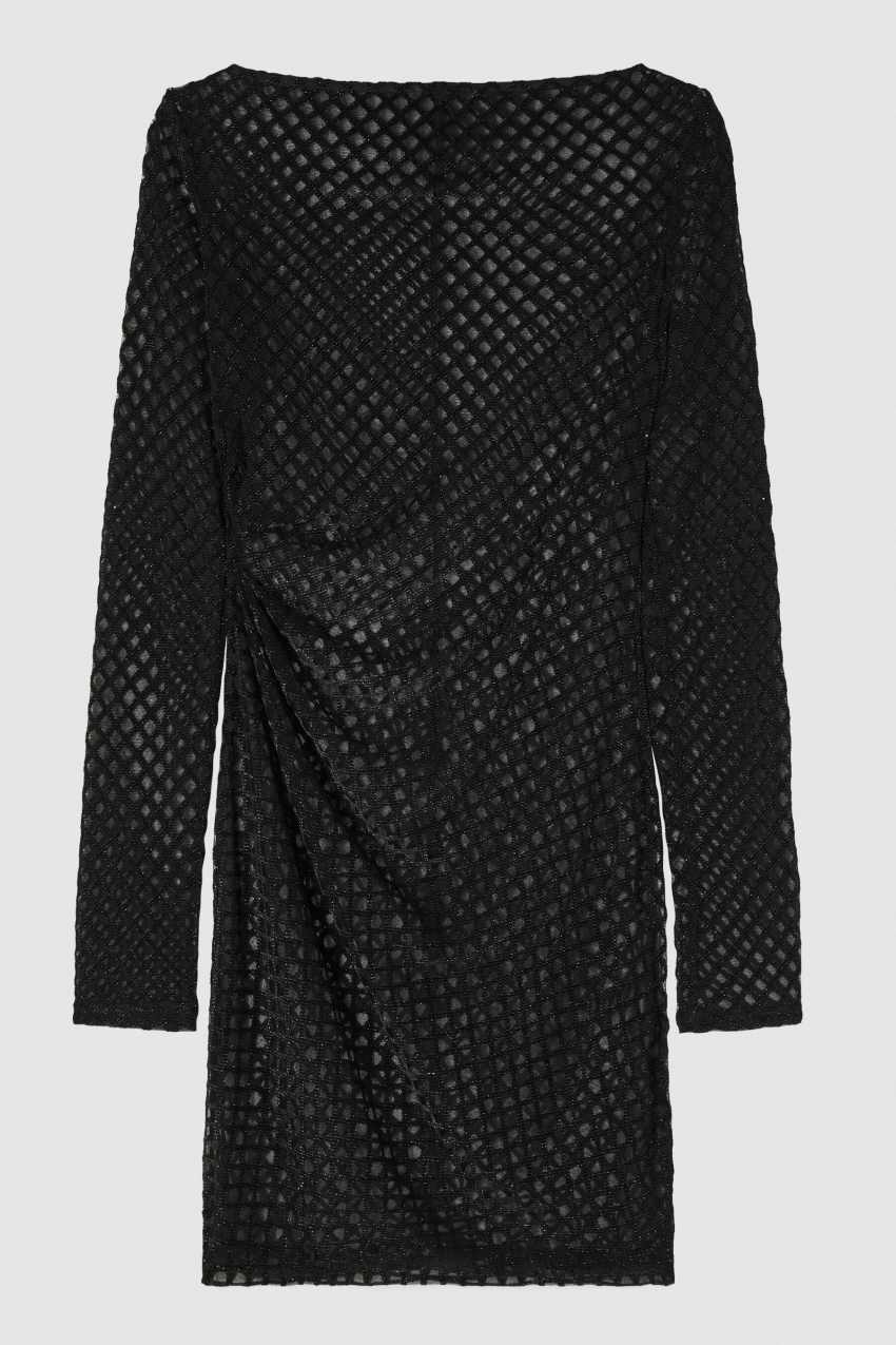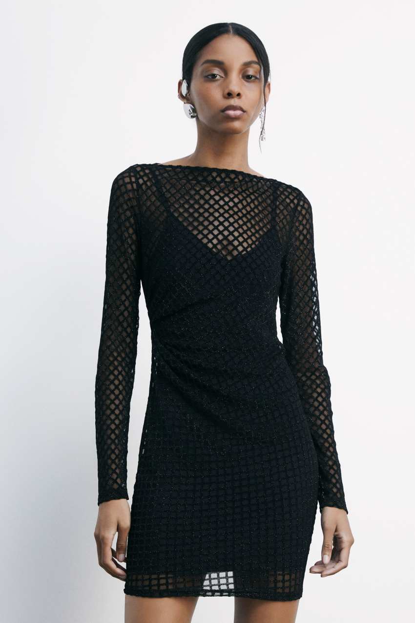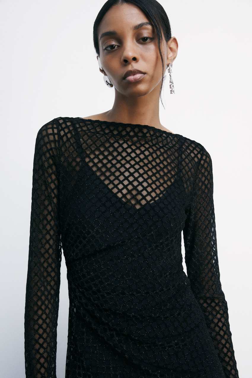realizzato in morbido tulle vellutato effetto rete con filati lurex intrecciati per un bagliore inaspettato.
