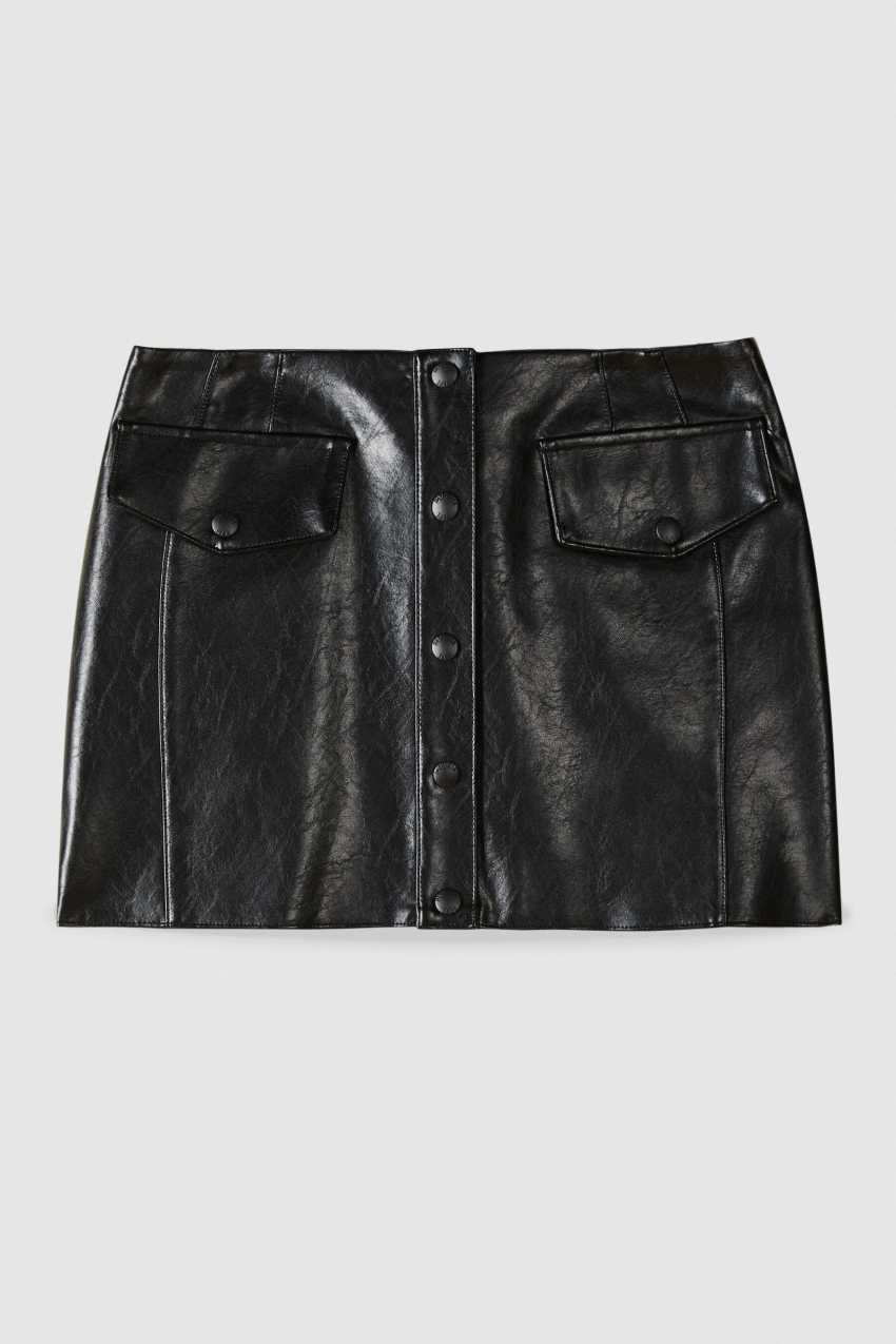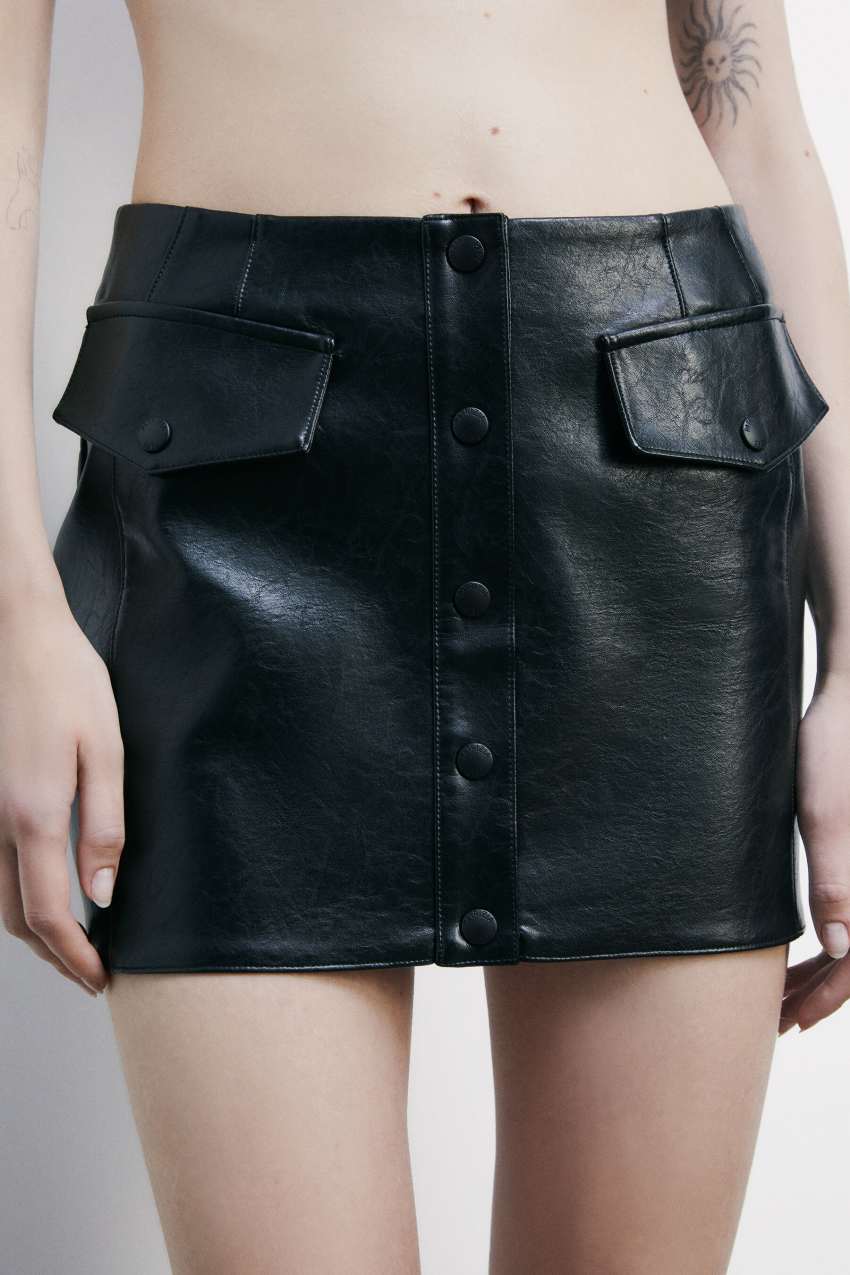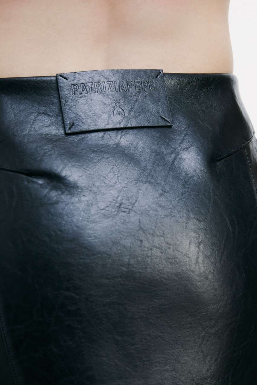 Il DNA rock-glam di Patrizia Pepe si esprime in questa mini gonna in morbido tessuto spalmato con chiusura a bottoni.