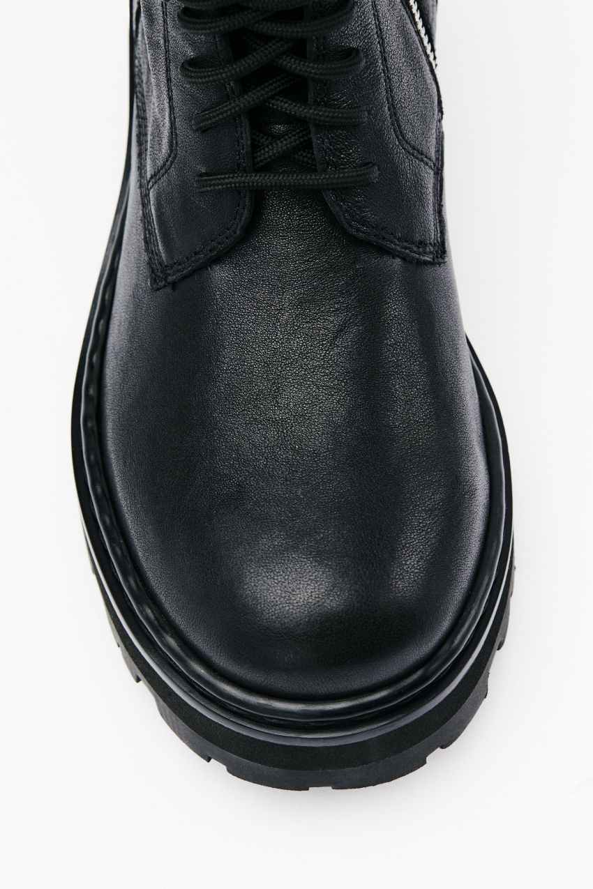 Il design stringato a 12 fori si completa con una suola platform con carrarmato leggero e una zip laterale interna per una calzata pratica.