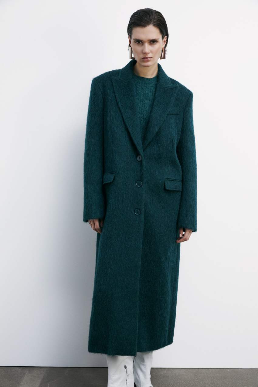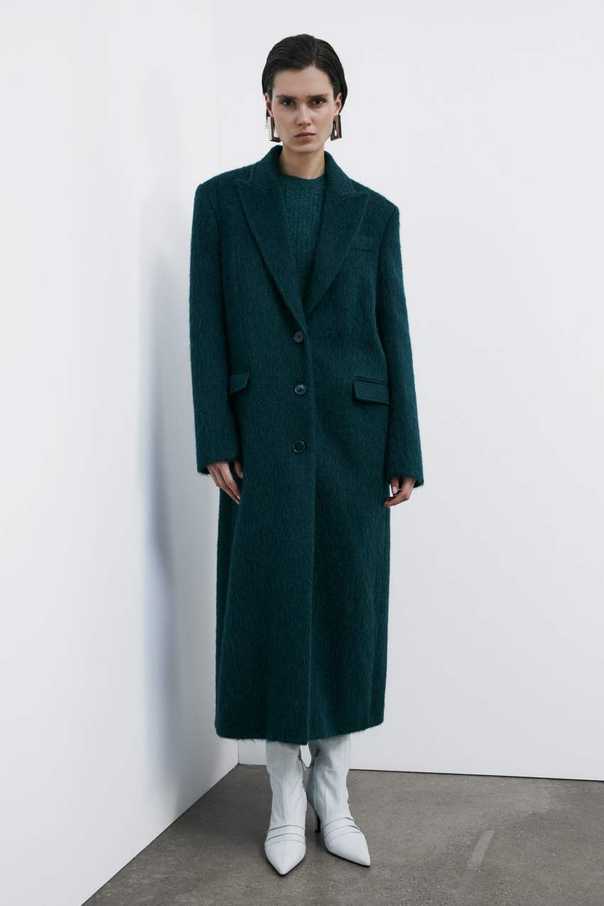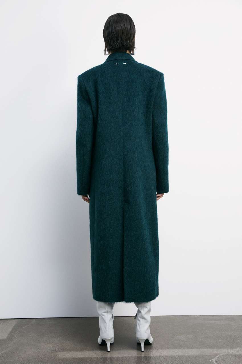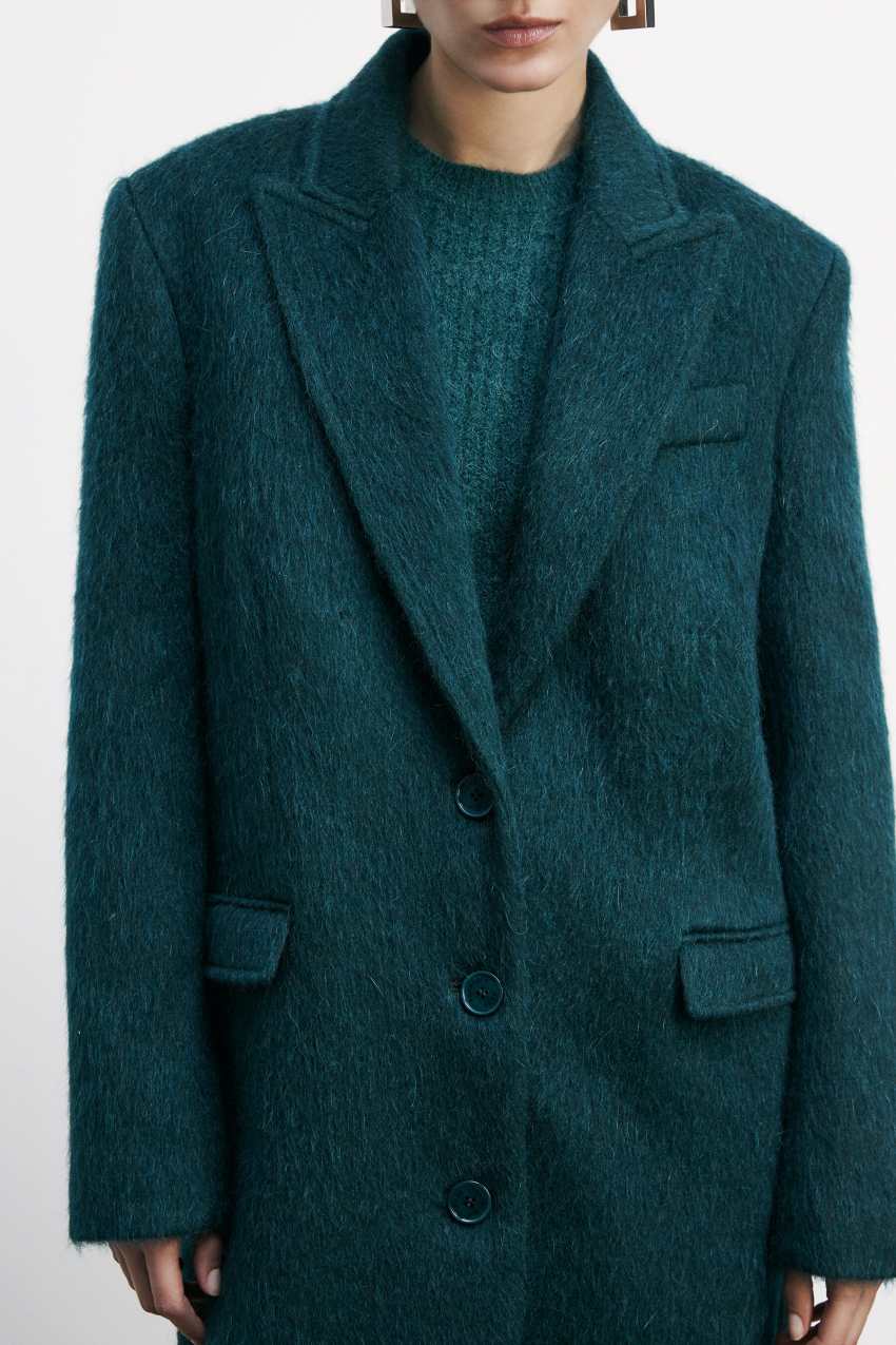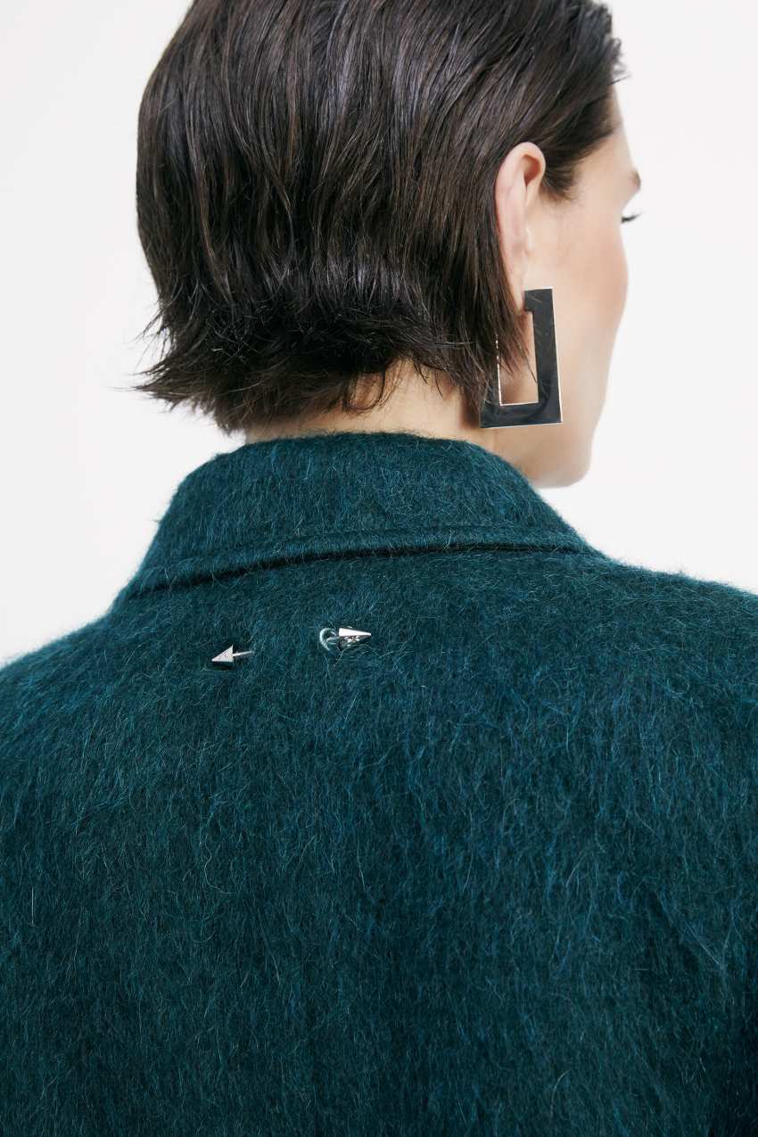 Le spalle pronunciate e il fit boyish si fondono con la morbidezza del panno a pelo lungo.