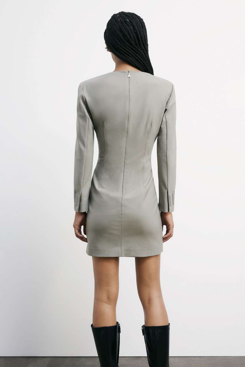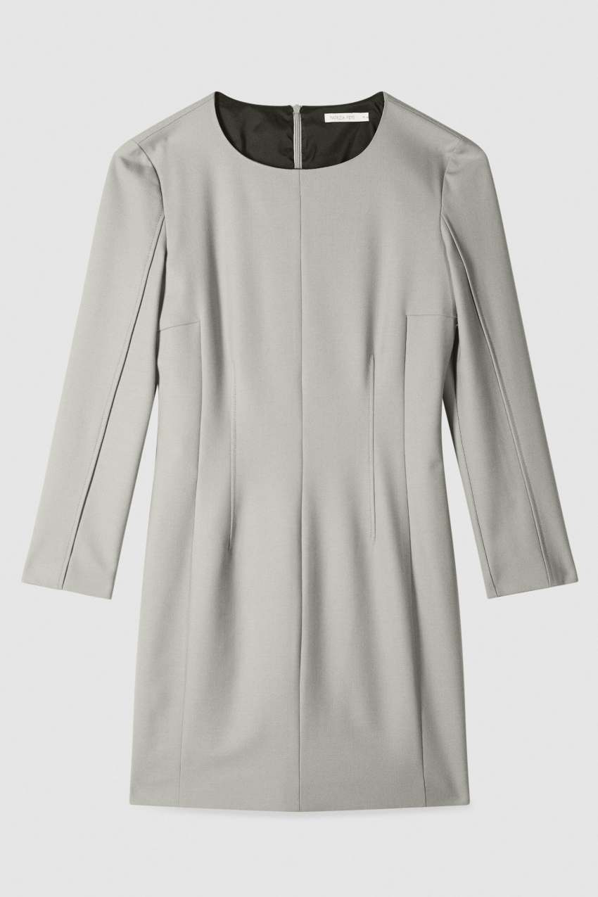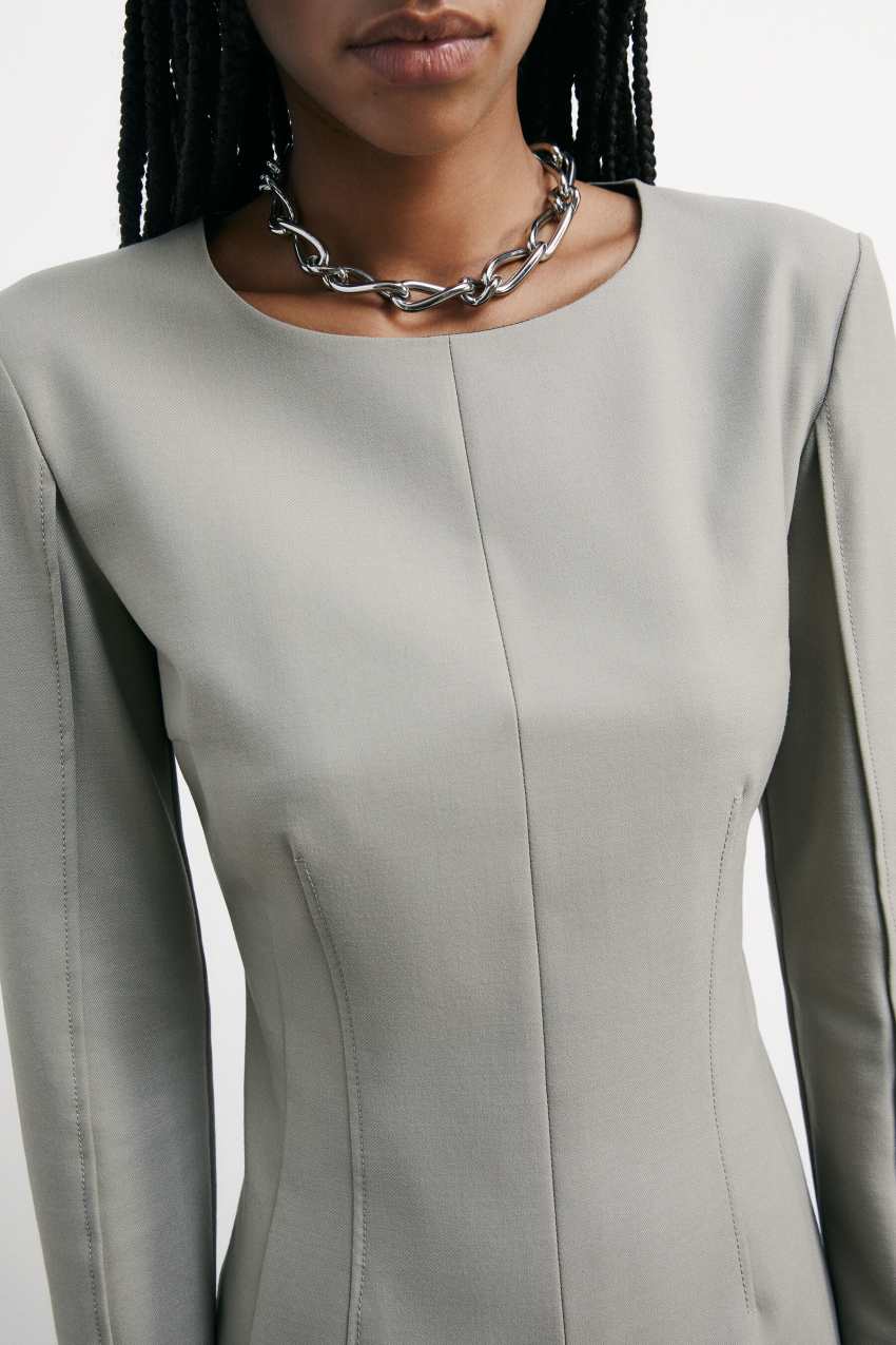 Il design strutturato scolpisce la silhouette con cuciture effetto bustier che percorrono il busto e accentuano la vita.
