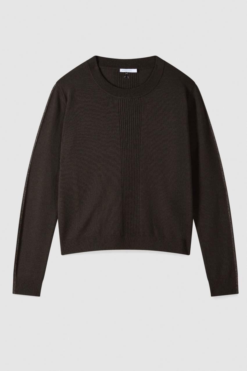 Si distingue per il dettaglio in lurex che percorre tutto il profilo delle maniche.