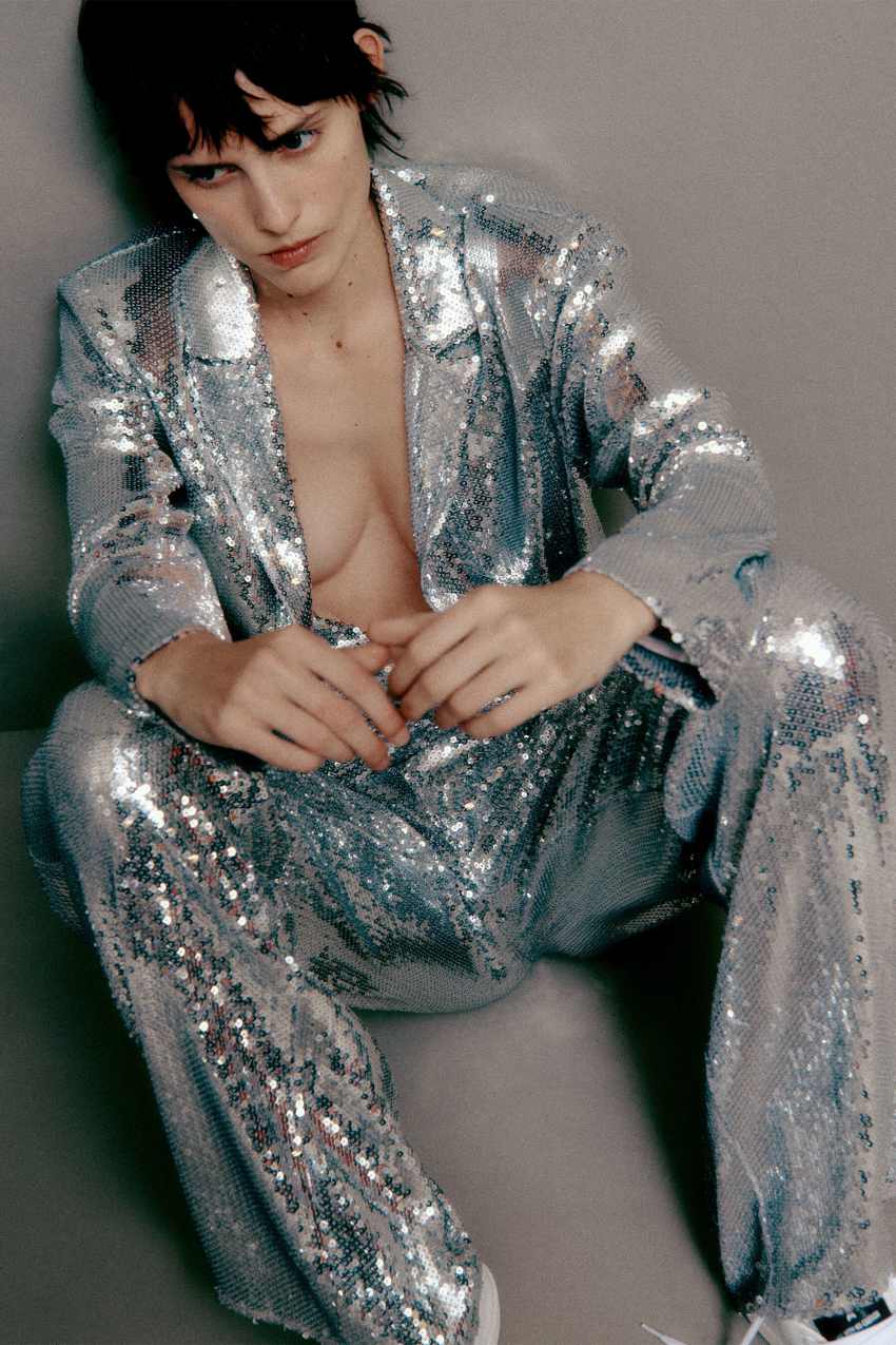 Indossalo con i pantaloni flare coordinati per un total look audace che illuminerĂ le tue serate speciali.