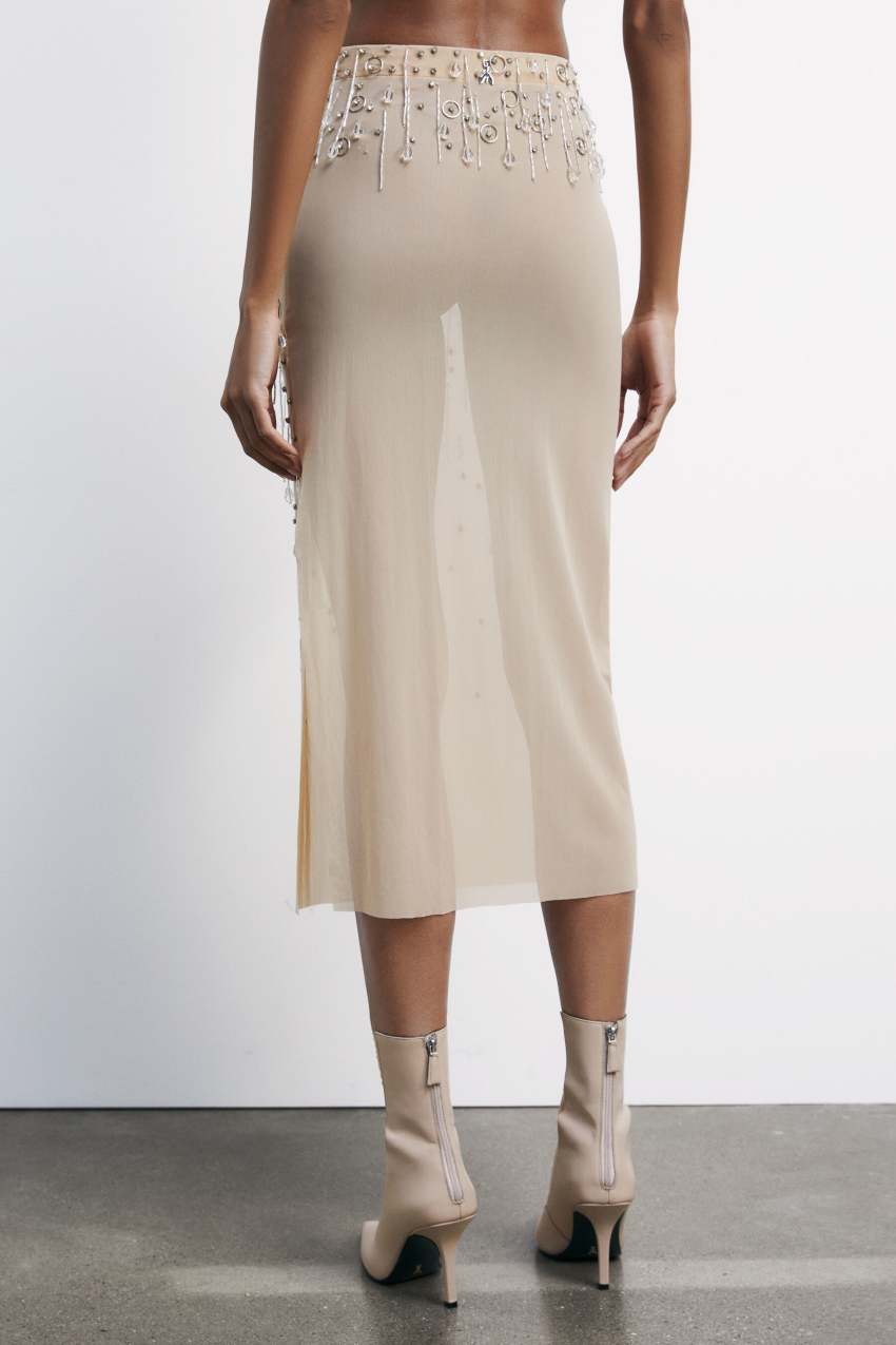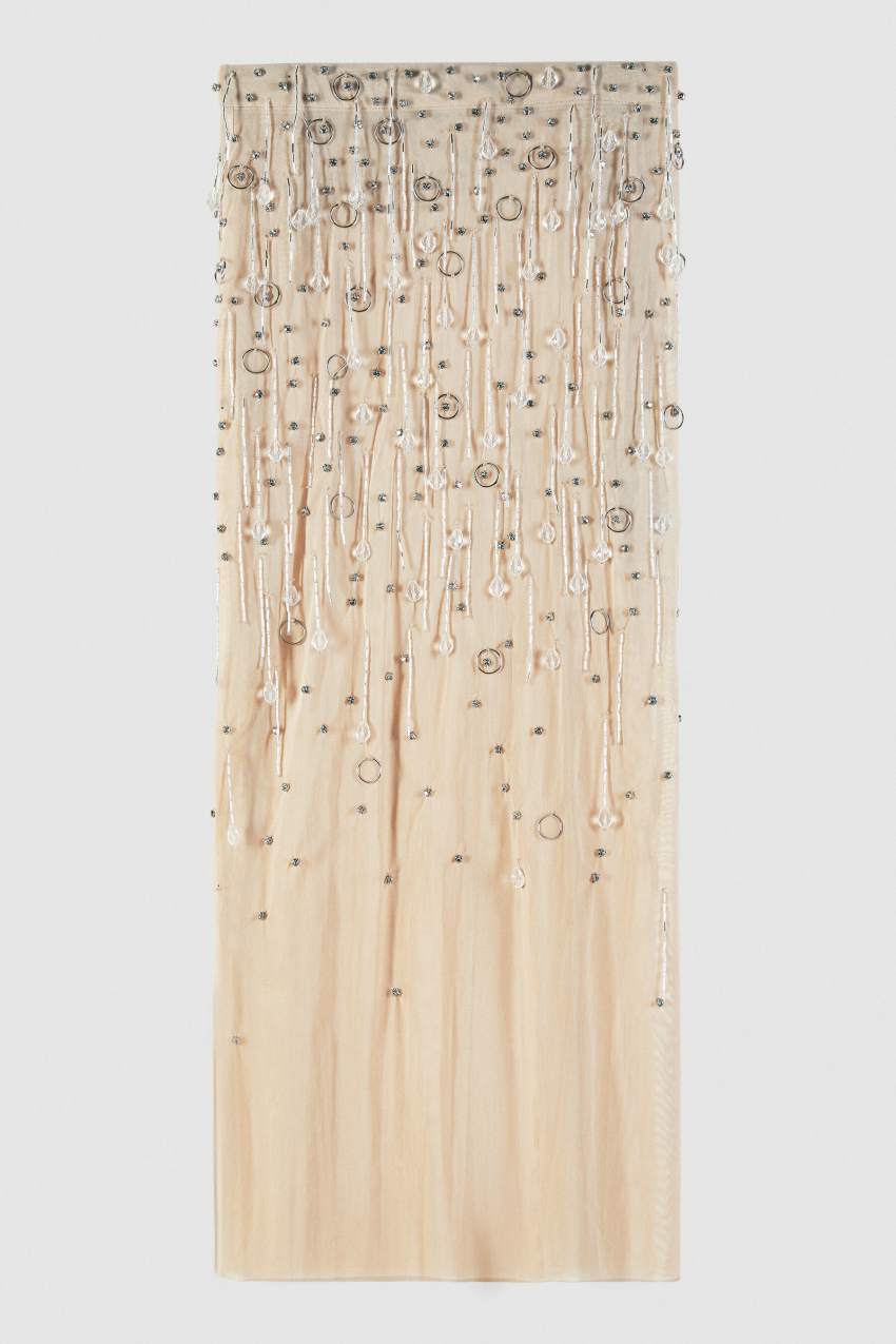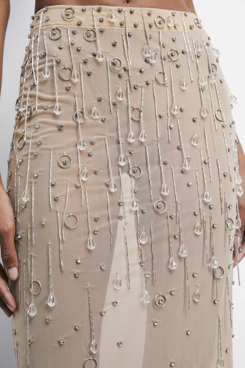Il mood Festive Time invernale si riassume nella lavorazione prestigiosa di questa gonna midi in tulle effetto second skin con ricami gioiello di castoni e gocce di cristallo che ci riportano tra le vette e i laghi ghiacciati.