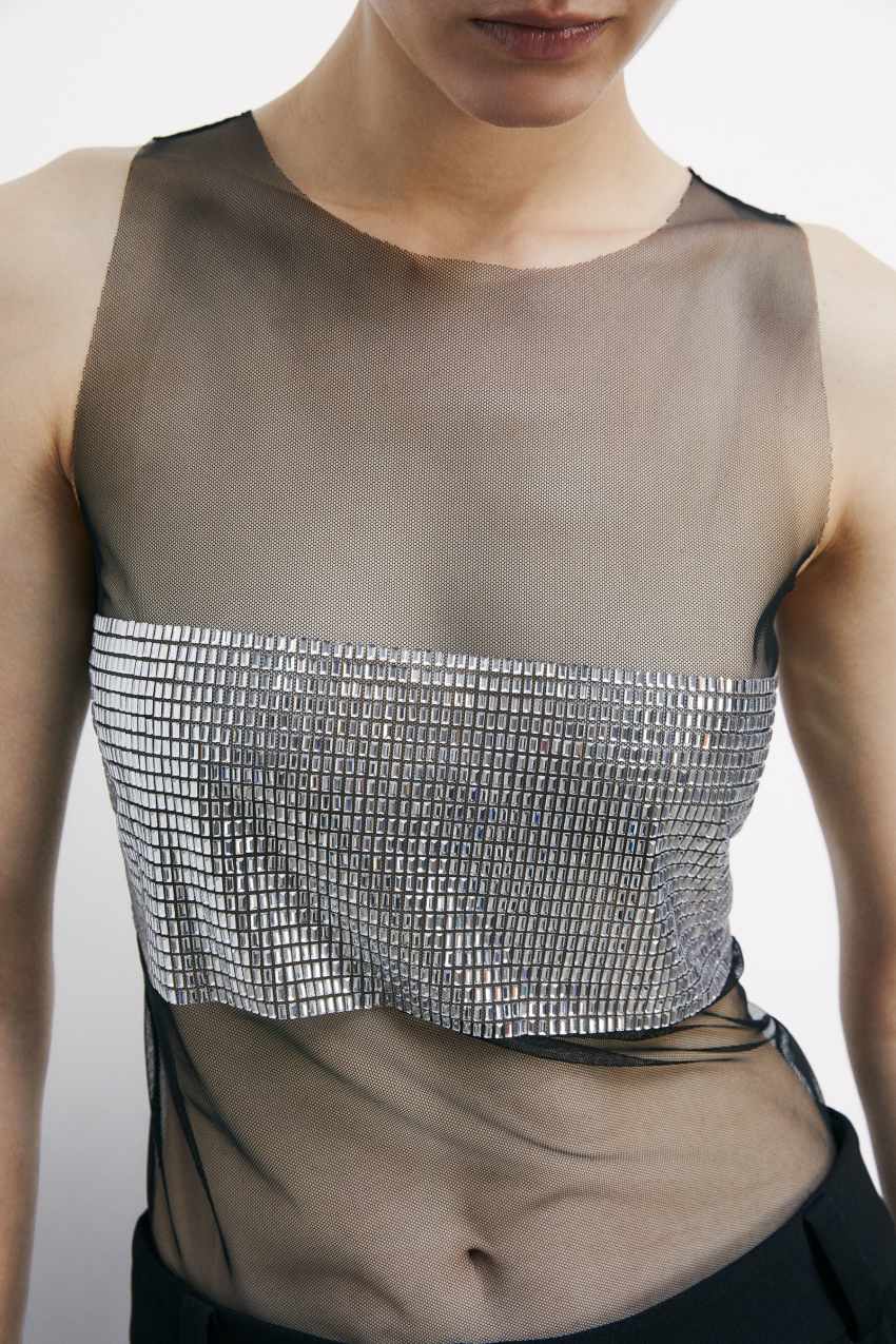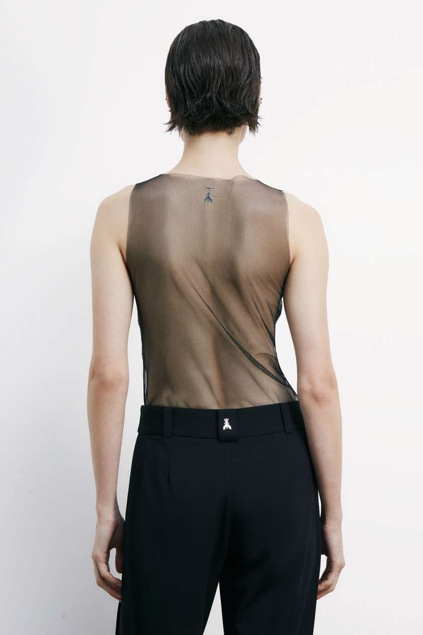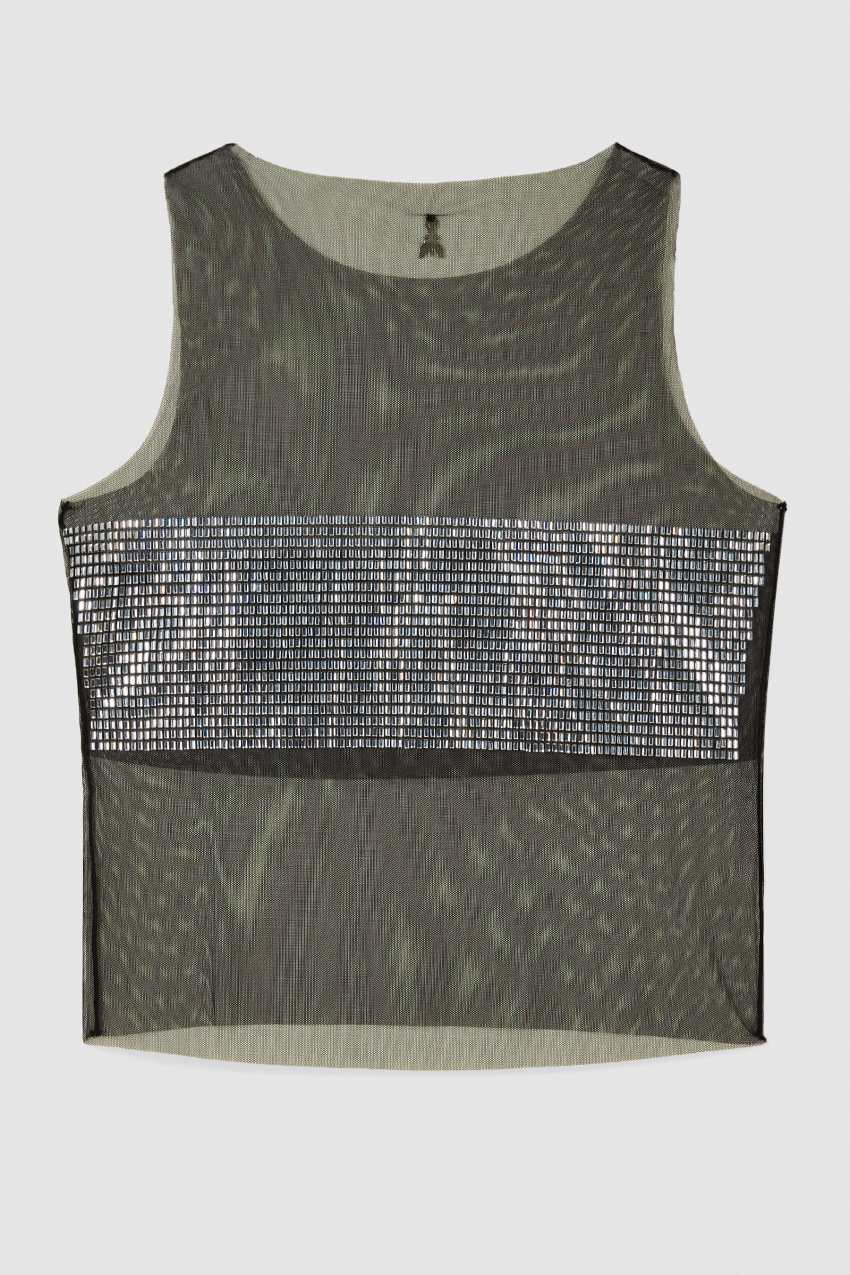 il top in tulle con design a canotta si distingue per la fascia di strass effetto gioiello e il logo Fly sul retro del collo.