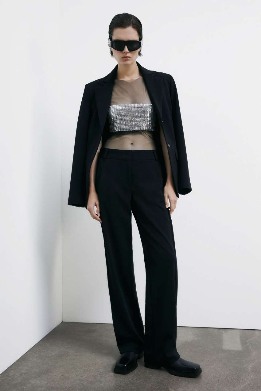 รจ ideale con pantaloni fluidi e blazer dal taglio over per un look di contrasti.