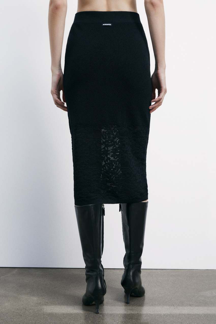 Gonna midi realizzata in maglia con lavorazione effetto pizzo per un sofisticato stile see-through.