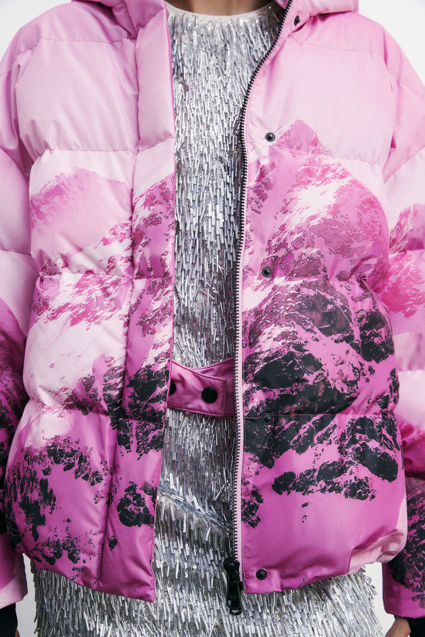 La capsule Chimeric Mountains introduce la giacca tecnica da sci imbottita con cappuccio.