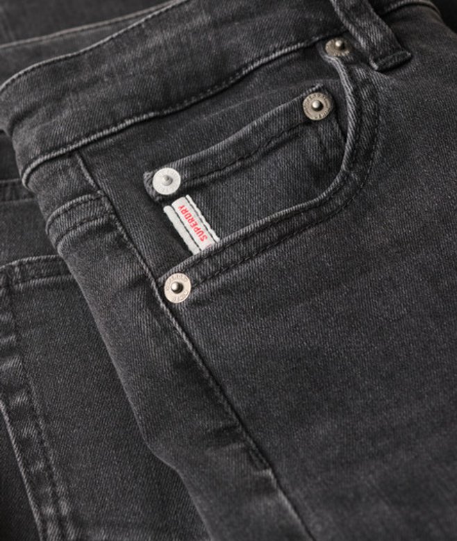 Zip and button fastening Belt hoops Two side pockets Coin pocket Two back pockets Signature Superdry badge Made with organic cotton grown using natural rather than chemical pesticides and fertilisers.