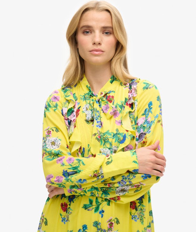 Tie and button fastening Button up cuffs Frilled detailling Tiered design Lined body Signature Superdry tab