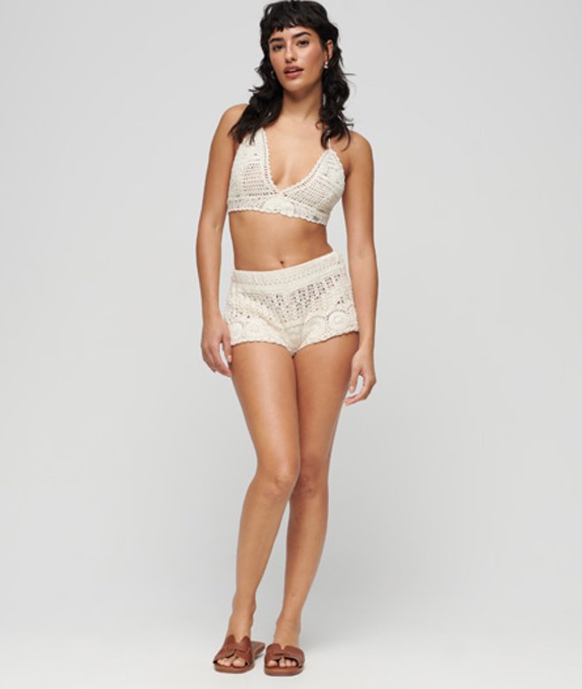 Slim fit - designed to fit closer to the body for a more tailored look Crochet design Deep v-neck Tie up halter neck Tie up hem Tassels Metal Superdry tab