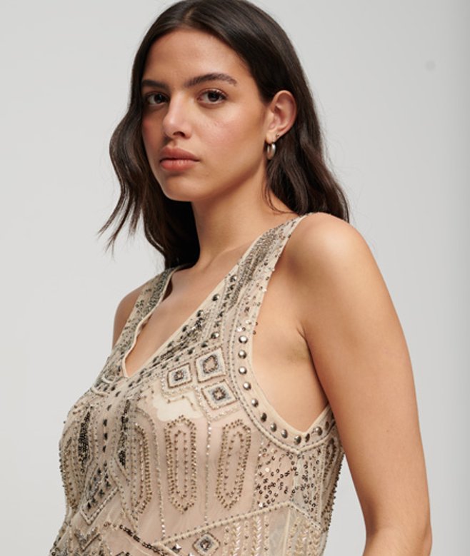 Superdry Women's Loose Fit Embellished V Neck Mini Dress, Cream | ricciano UNITED KINGDOM