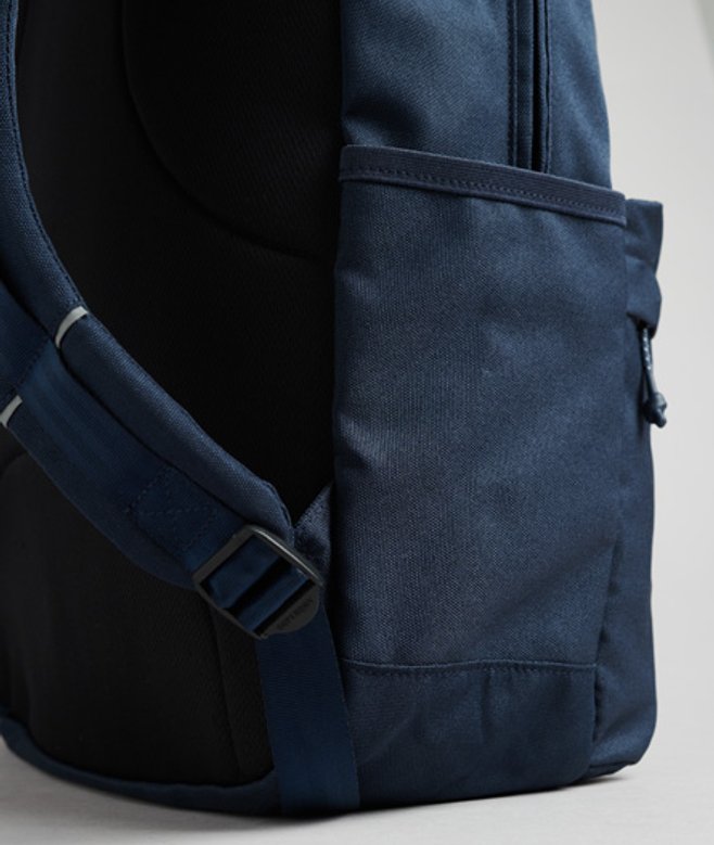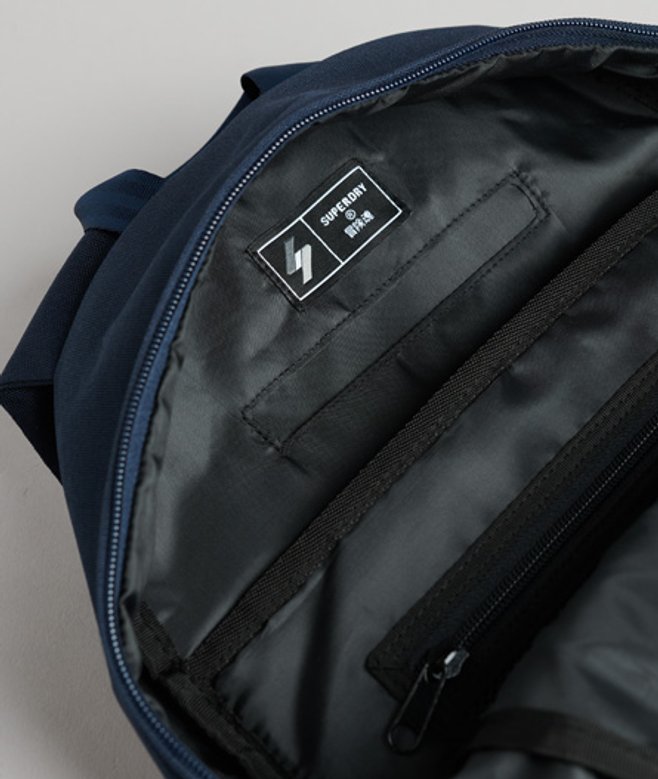 Classic hiking design Top grab handle Main zipped compartment Zipped lower compartment Two side pockets Padded and ventilated back panel Adjustable shoulder straps Internal padded laptop sleeve (15" max screen size) Zipped inner compartment Printed Superdry branding 18 litre approximate capacity H 45cm x W 30cm x D 13.5cm