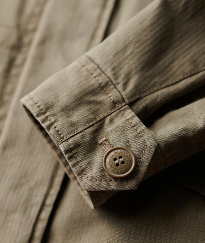 Go for your normal size Classic military design Vintage finish herringbone fabric regular collar Zip and popper fastening Two patch pockets on the chest with popper fastenings Two welt pockets with popper-fastened flaps Two side welt pockets Button adjustable cuffs Fully lined Single inner pocket Tiger's head embroidery on the back Sleeve logo patch Pocket logo patch Internal waist drawcord
