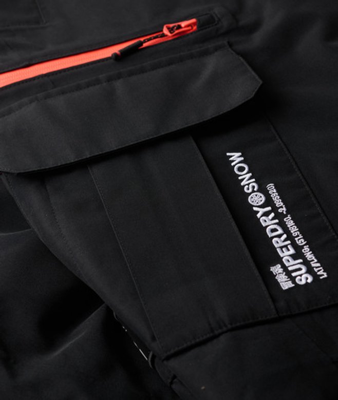 Go for your normal size Breathable 20k/mm - Provides airflow comfort for very high-level activity Waterproof 20k/mm - Waterproof under high pressure, for heavy rain and wet snow Fully taped seams - Seams have been internally taped to help prevent water penetration Zip and popper fastening Belt loops Hook and loop on the waistband Seven external pockets, two on the back Zip and popper fastening on the cuffs Second trouser leg with elasticated cuffs Internal gaitors Contrasting Superdry embroidered text on the leg and back pocket