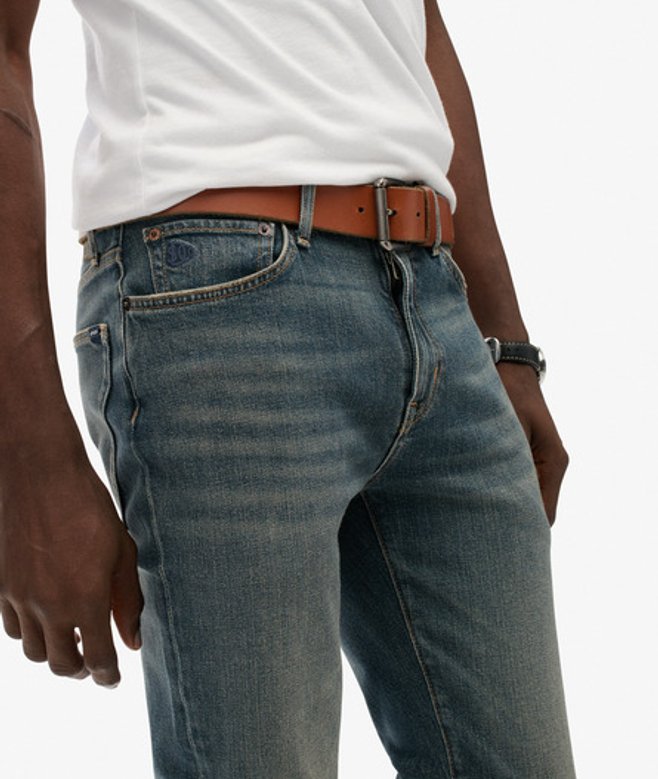 Button and zip fastening Five pocket design and belt loops Embroidered logo on coin pocket Branded hardware Denim, the staple that carries you all through the seasons with no doubt.