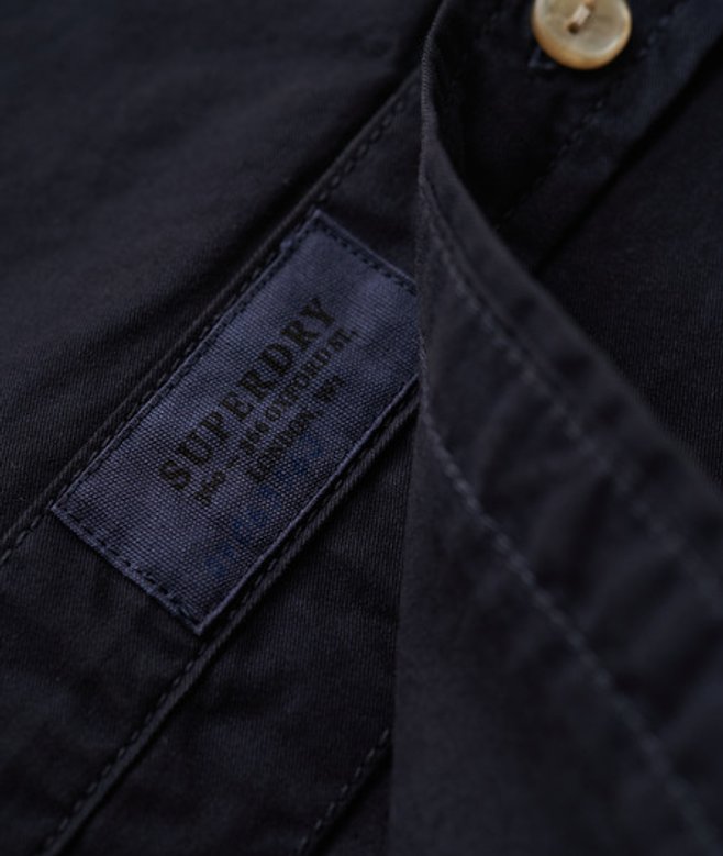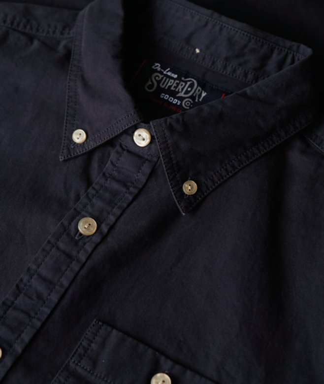 Wähle deine normale Größe Hochwertiger Baumwoll-Twill mit hoher Dichte Button-Down-Kragen Kragen mit doppeltem Knopfverschluss Einzelne Brusttasche mit Knopfverschluss Verlängerte untere Knopfleiste Kellerfalte hinten Dezentes, handgezeichnetes Superdry Logo an Knopfleiste und Seitennaht