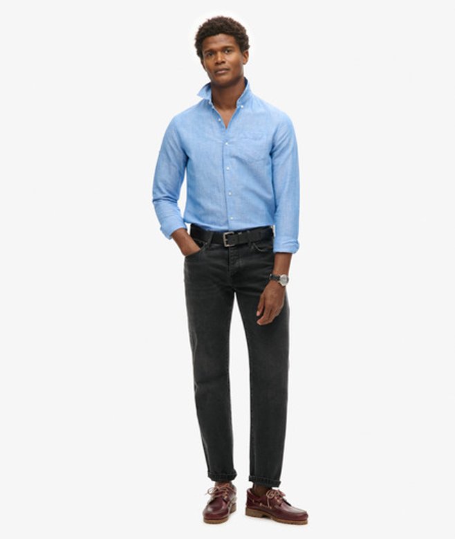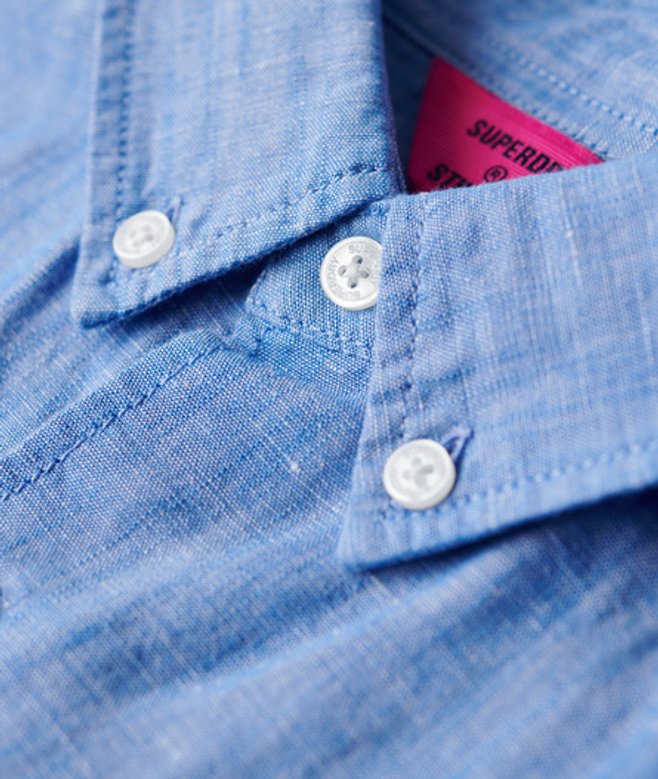 Col classique Fermeture principale boutonnée Manches longues Poignets boutonnés Poche poitrine Coton biologique Étiquette Superdry signature sur la manche droite Écusson signature Superdry sur l'ourlet Mélange de lin et de coton bio.
