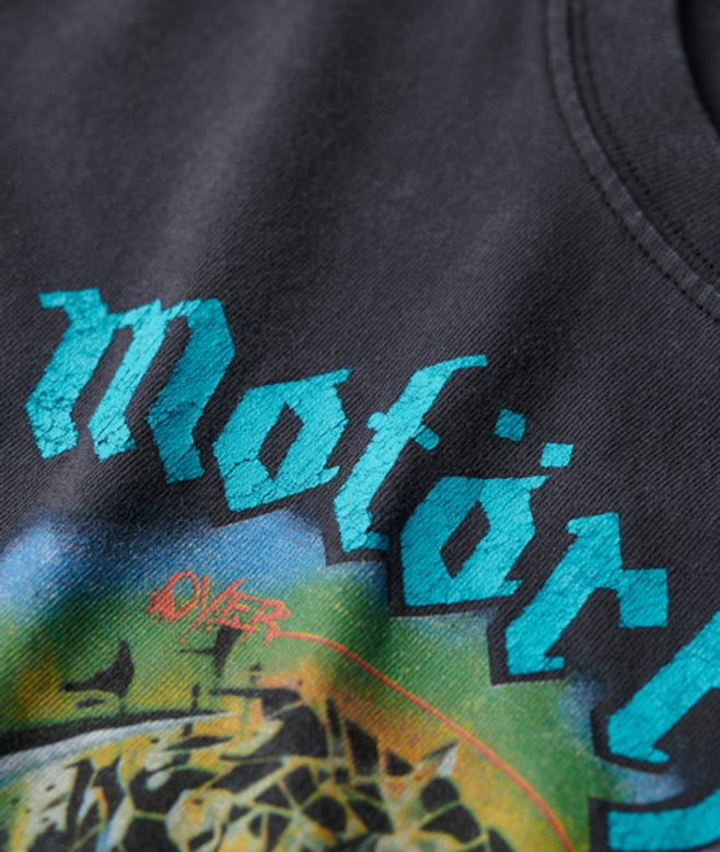 T-shirt classique Motörhead x Superdry en édition limitée avec Snaggletooth, la mascotte du groupe également appelée War-Pig, marquant la tournée Iron Fist de 1982 avec une liste des dates britanniques.