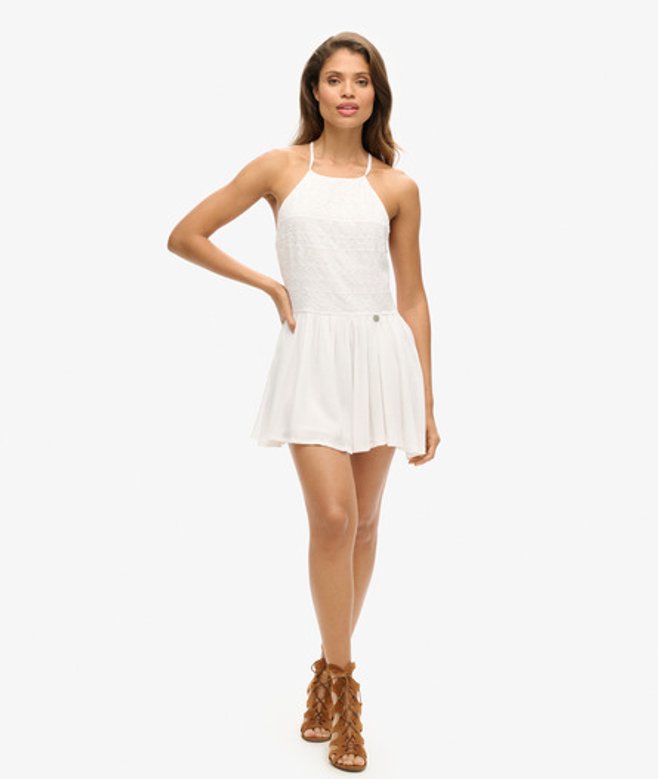 Coupe ajustée pour un look encore plus élégant Dos nu avec cordon à nouer Tissu en crêpe léger Corset brodé Jupe froncée Dos ouvert Fermeture zippée dissimulée au dos Entièrement doublé Écusson Superdry métallique à la taille