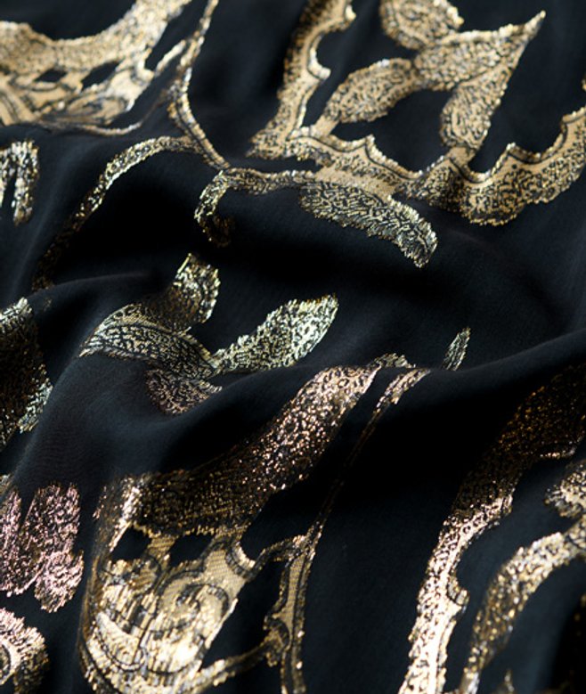 En parfaite harmonie avec l'empiècement transparent vert foncé, les fils dorés délicatement tissés du motif rappelant un imprimé cachemire déconstruit apportent de l'éclat et permettent à la lumière de jouer avec la robe lorsque tu te déplaces.
