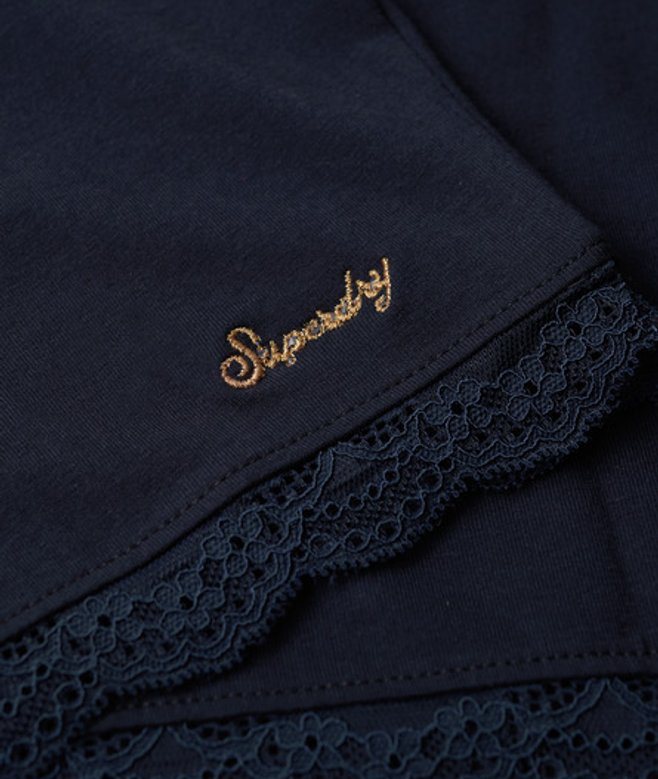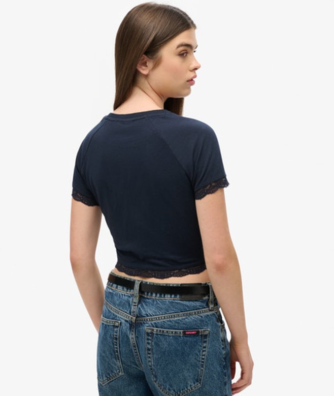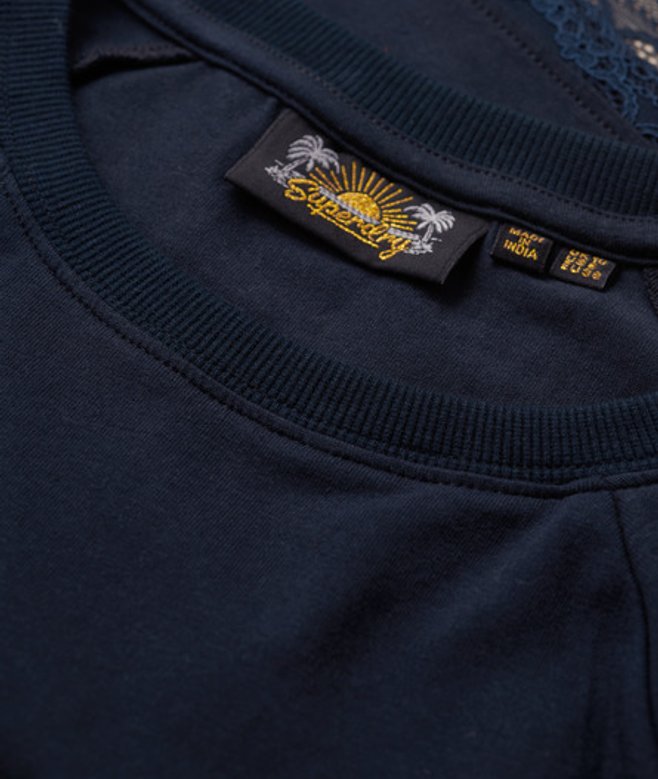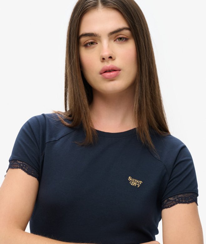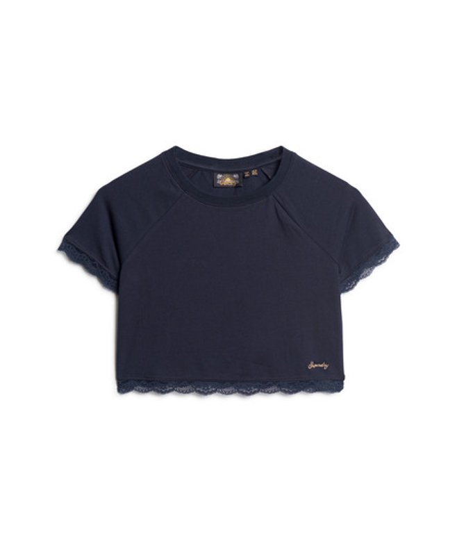 Superdry Dames Bleu Marine T-Shirt Esprit Années 90 Bordé de Dentelle,