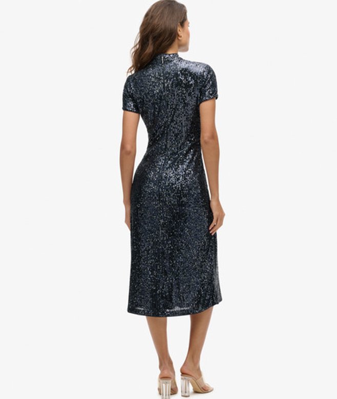 Cette saison, fais souffler un vent de fraîcheur sur ta garde-robe festive avec notre robe mi-longue à col Mao et sequins.