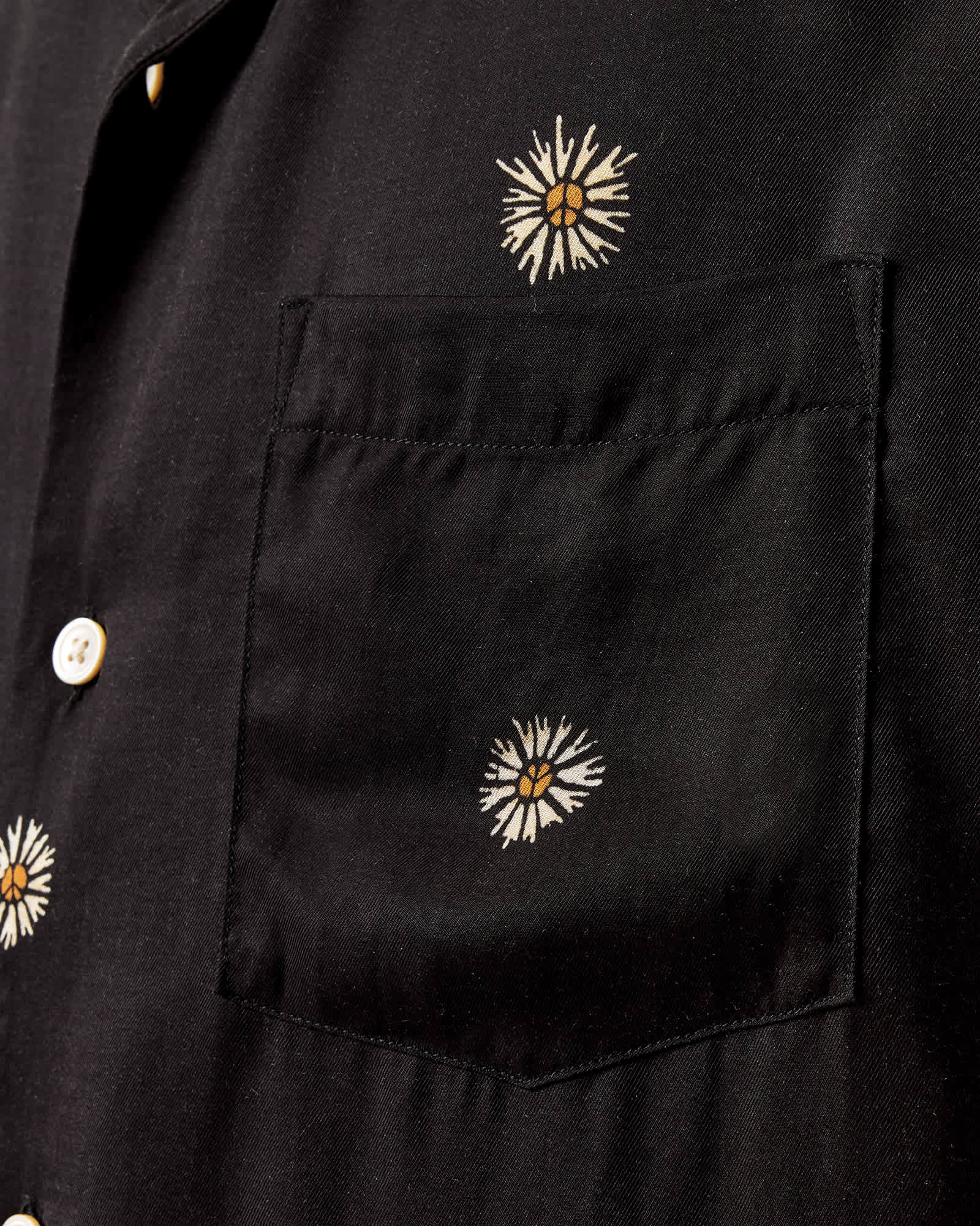 This shirt is designed to a relaxed fit Hawaiian collar Button closure Short sleeves Chest pocket Flower and peace print, This shirt is designed to a relaxed fit, Hawaiian collar , Button closure