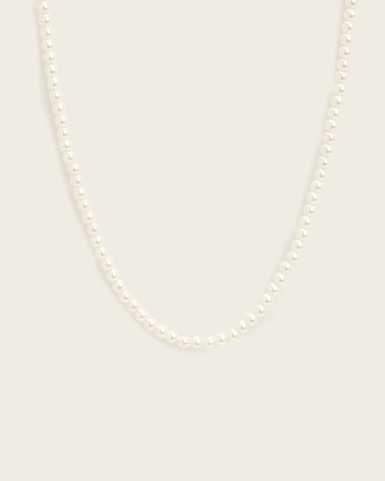 Our faux pearls make the chain that holds an oversized carabiner clasp engraved with our All Saints logo.