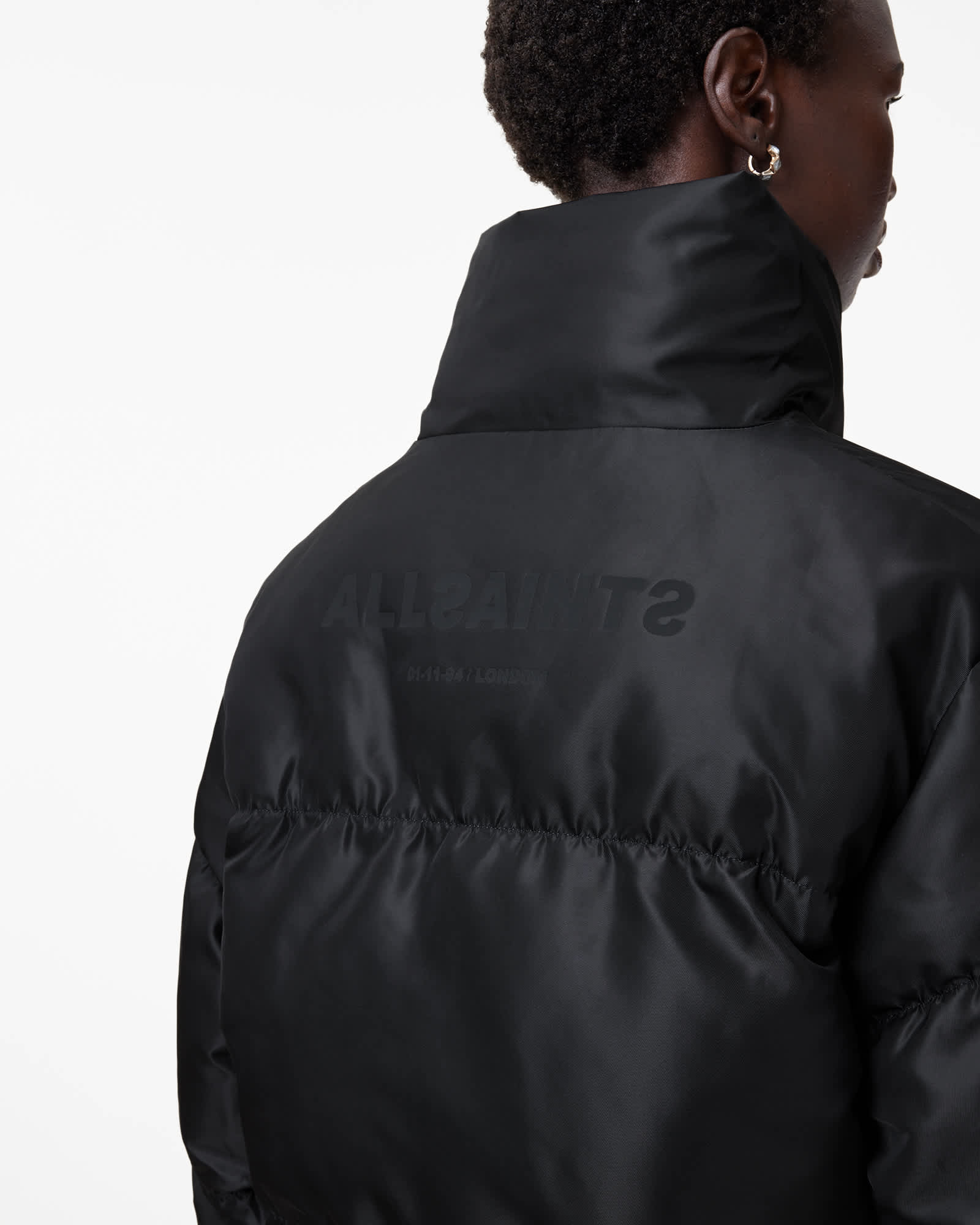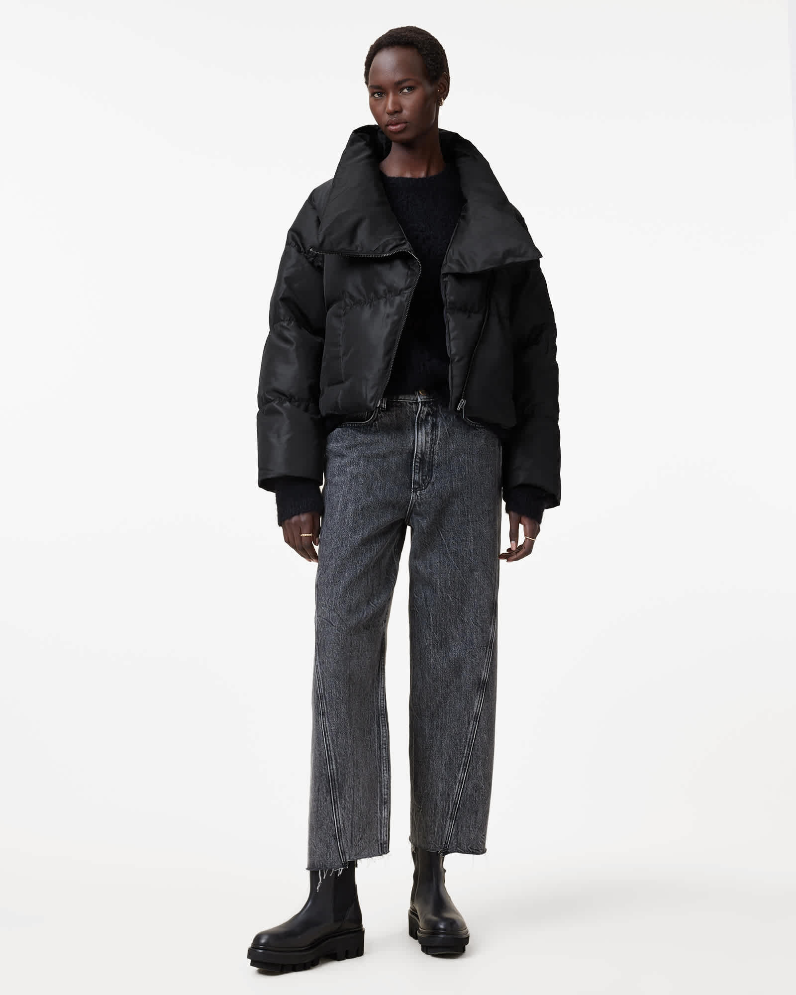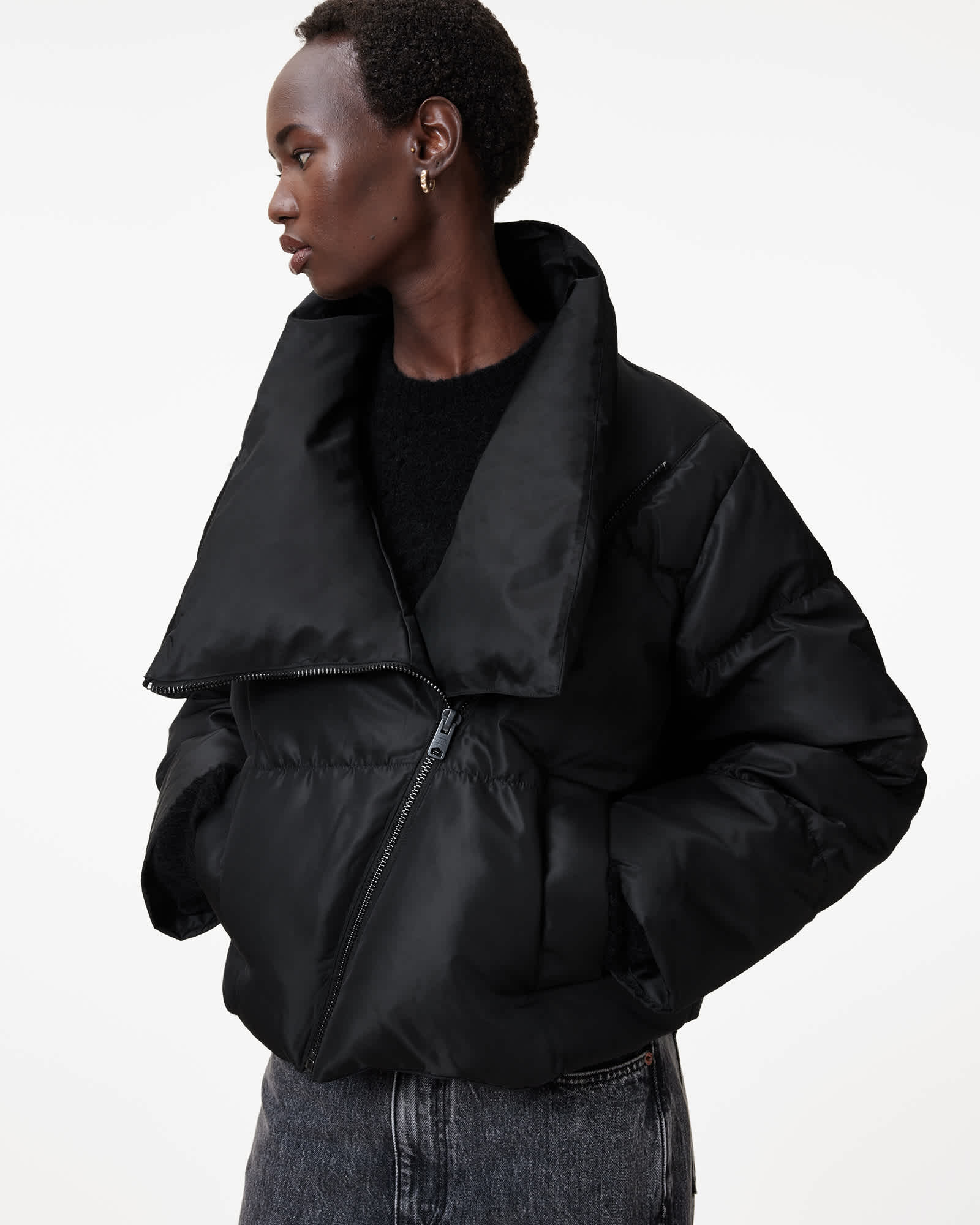 AllSaints Nickol Asymmetric Cropped Puffer Jacket,, Black
