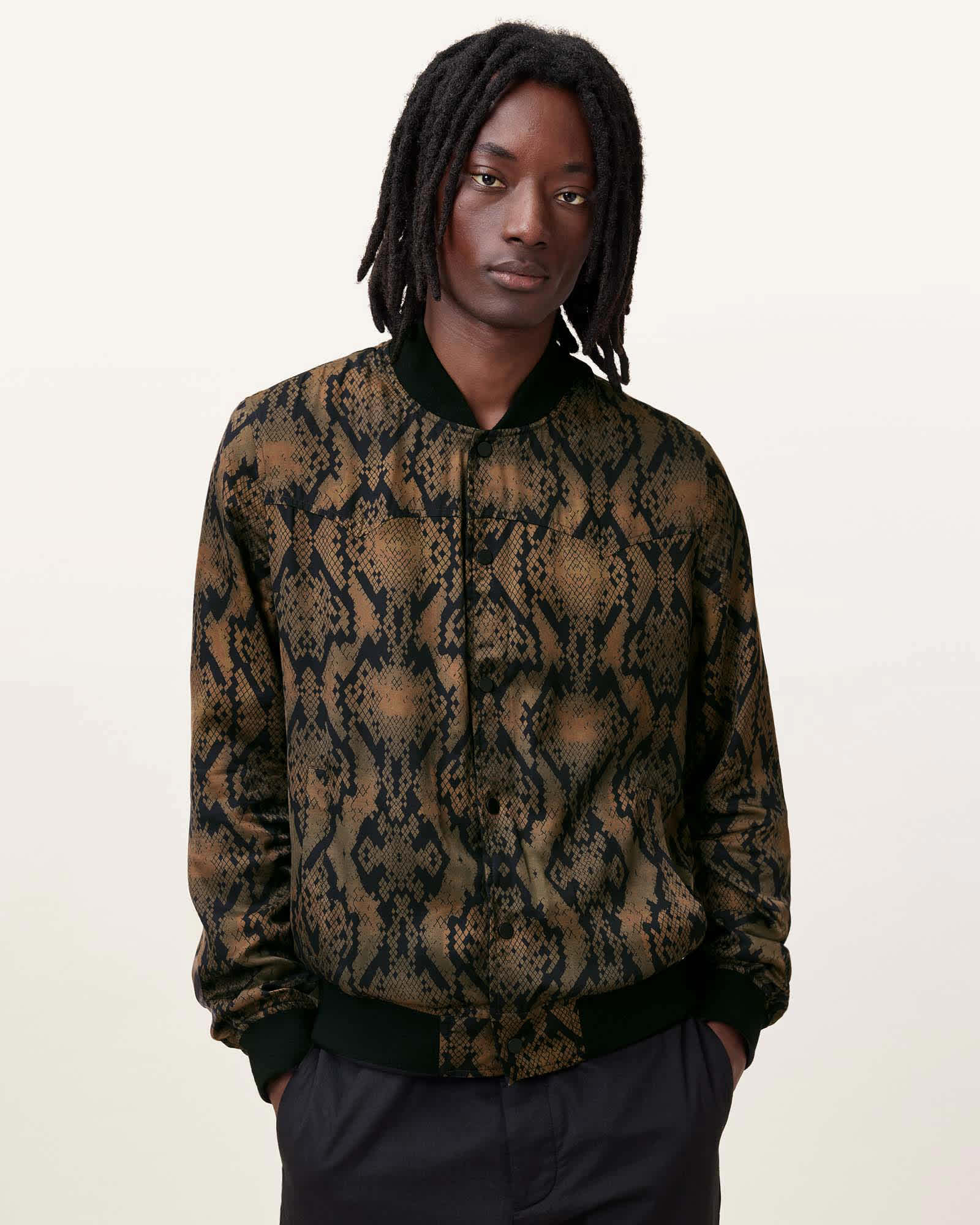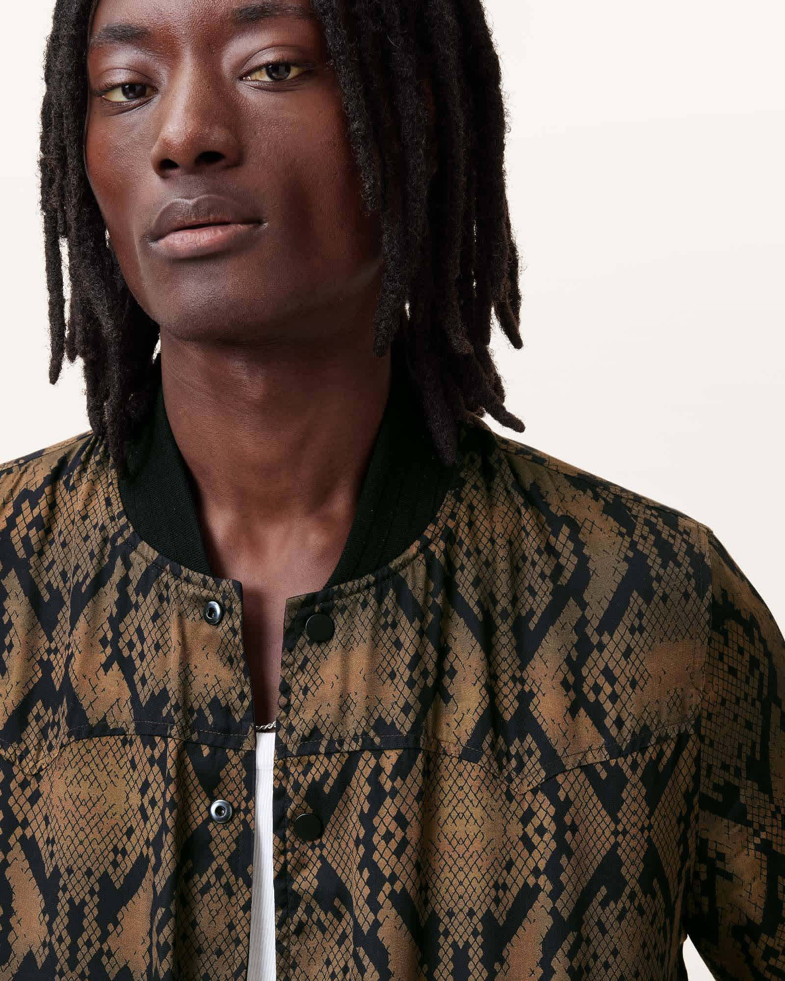 This jacket is designed to a regular fit Reversible style - one side is black satin, one side is our new season Boa snake print Collar Push stud closure Long sleeves Matte black hardware Western yoke detailing Metal branded clips Two lower front pockets