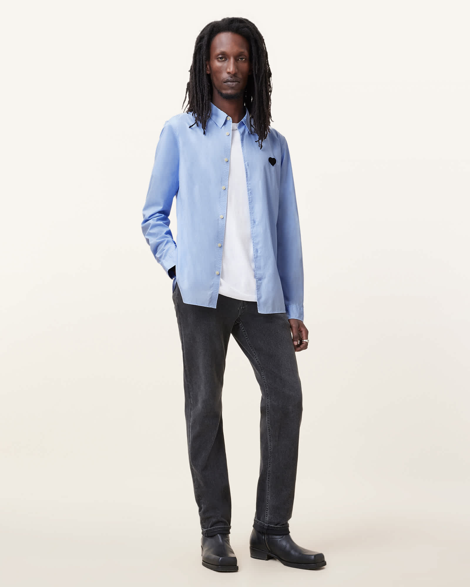 AllSaints Amante Heart Embroidered Slim Fit Shirt,, Willow Blue | ricciano CANADA