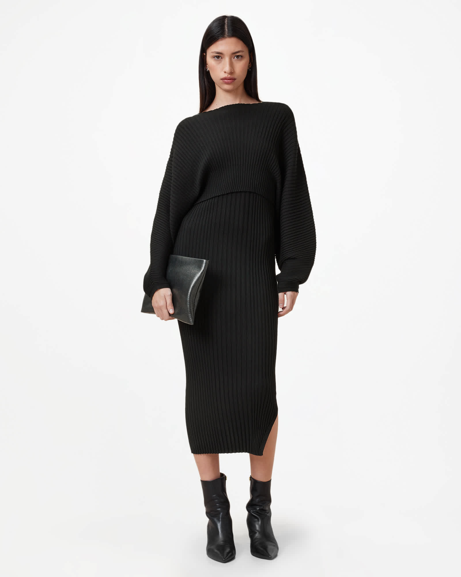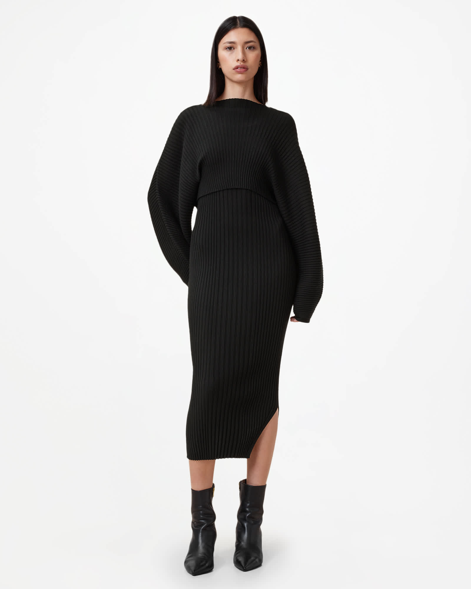 2-in- 1 style This dress is designed to a bodycon fit The sizing of this style is dual sized, we recommend sizing up if you prefer a looser fit XS=UK 2/4, S=UK 6/8, M=UK 8/12, L=UK 14/16 Dress Ribbed circular knitted technique Midi length Pullover Split side seam This jumper is designed to a regular fit Jumper Boat neck Long batwing sleeves Cropped