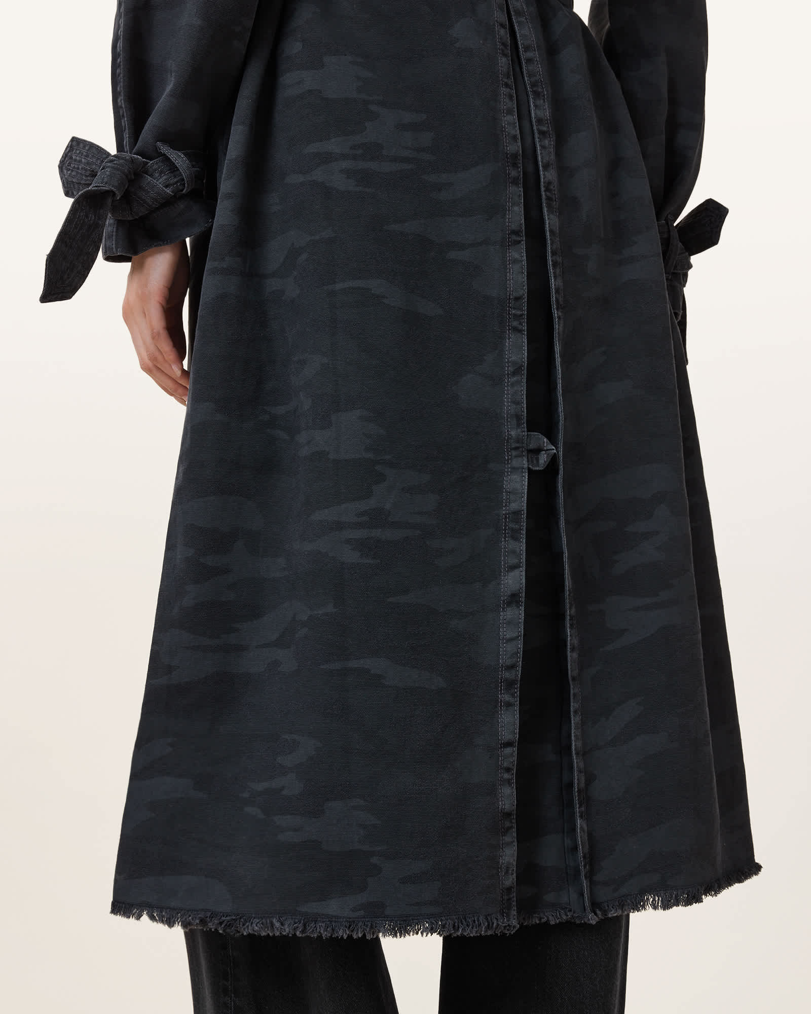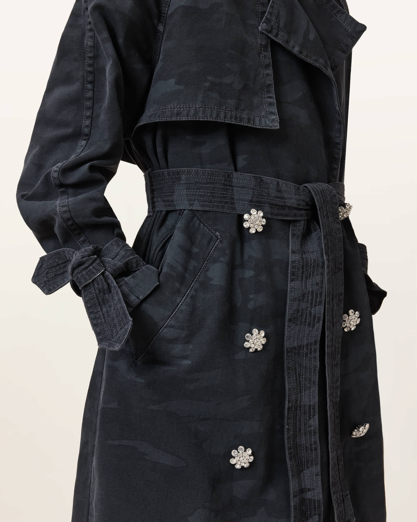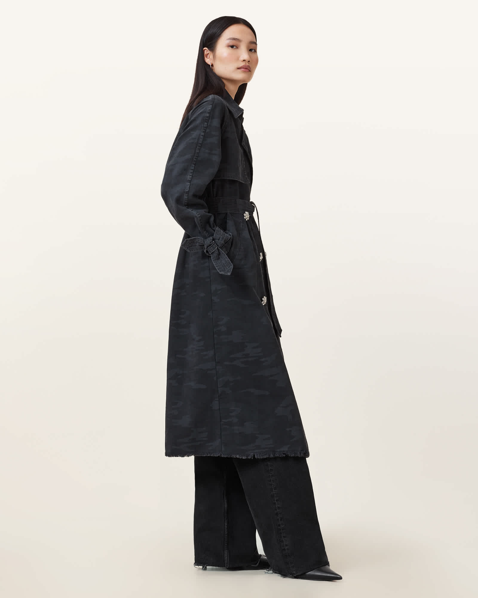 com This coat is designed to an oversized fit, we recommend sizing down for a closer fit Button closure Collar Long sleeves Double breasted Self-tie belt Two front welt pockets Curved back storm flap