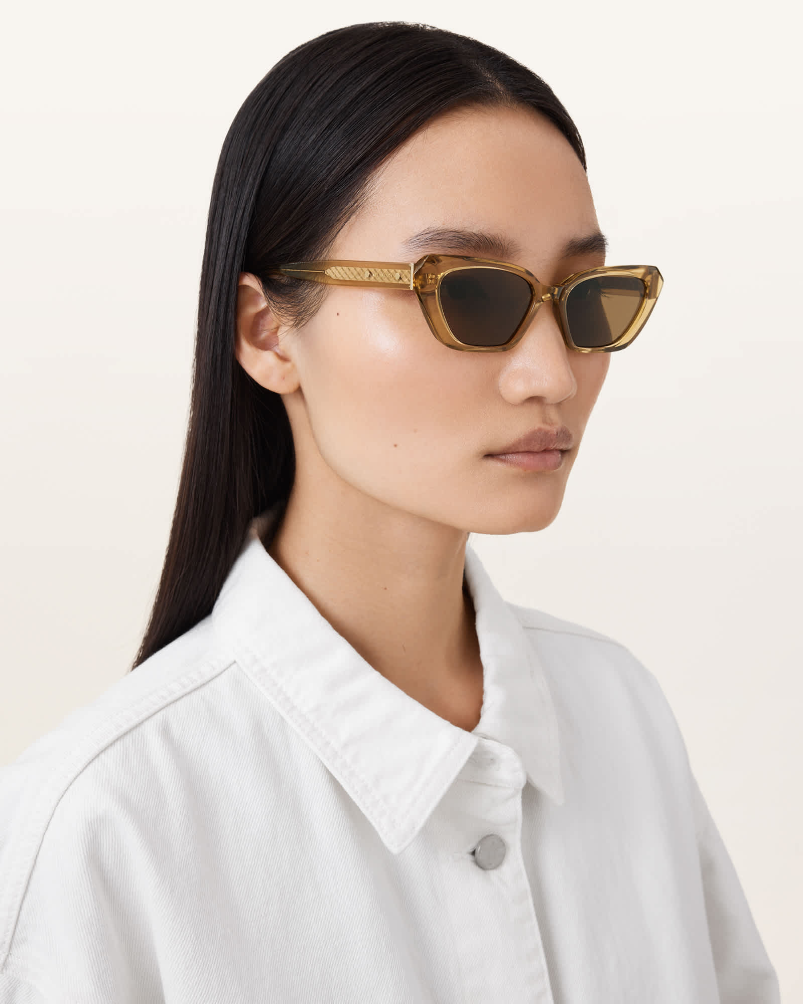 Square cat eye frames Signature hexagon metal detailing Magnetic fastened case Recycled lens cloth Please note, these sunglasses are not suitable to wear while driving