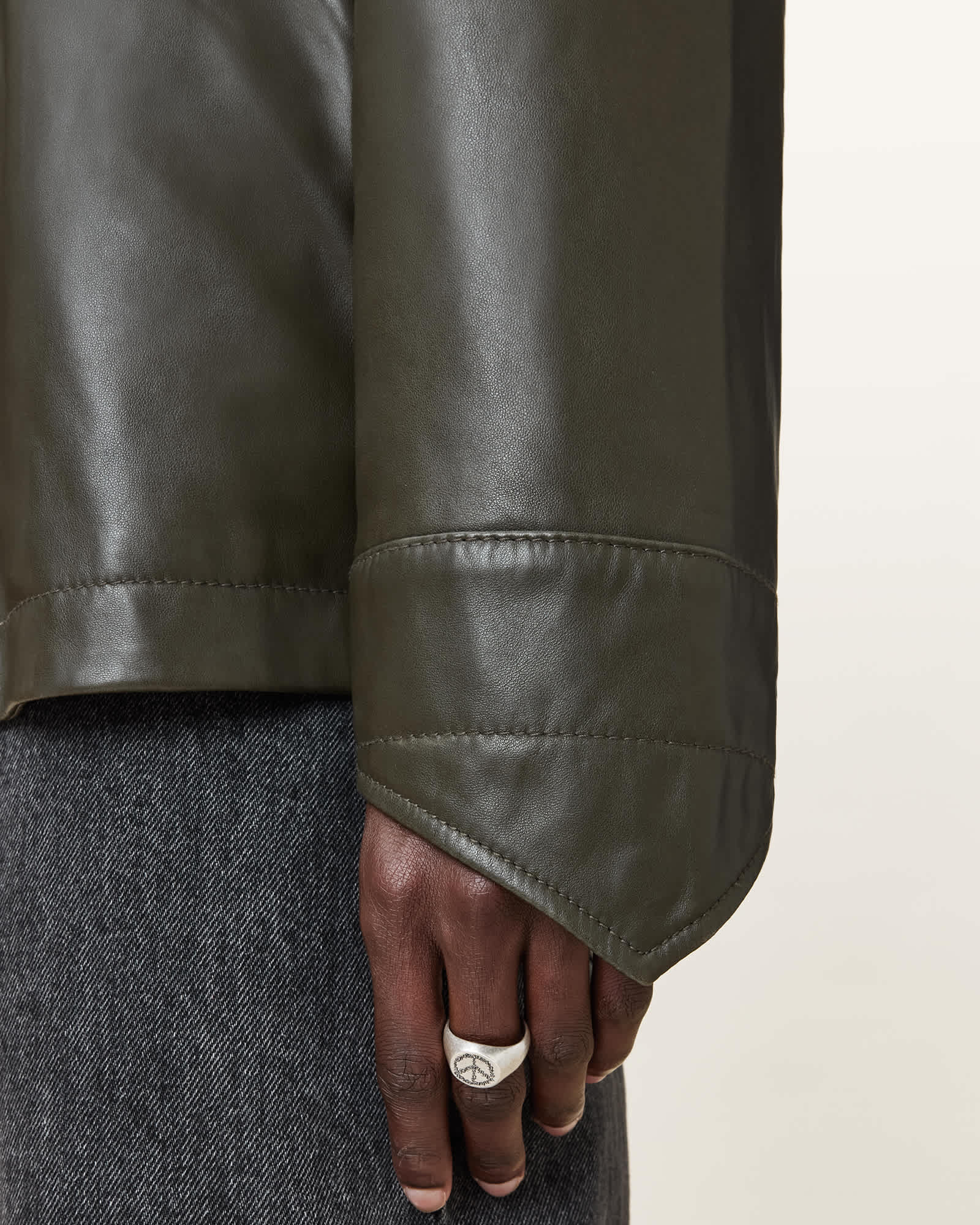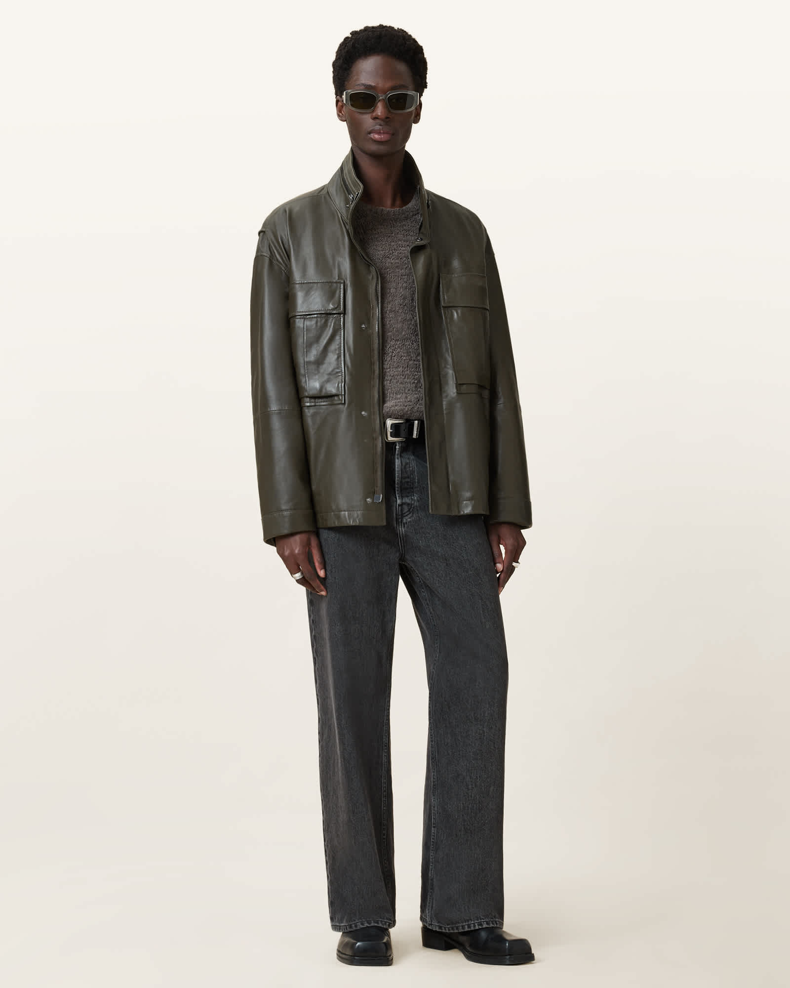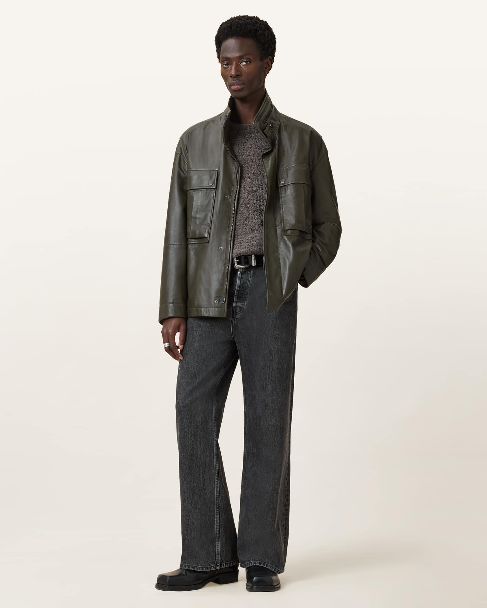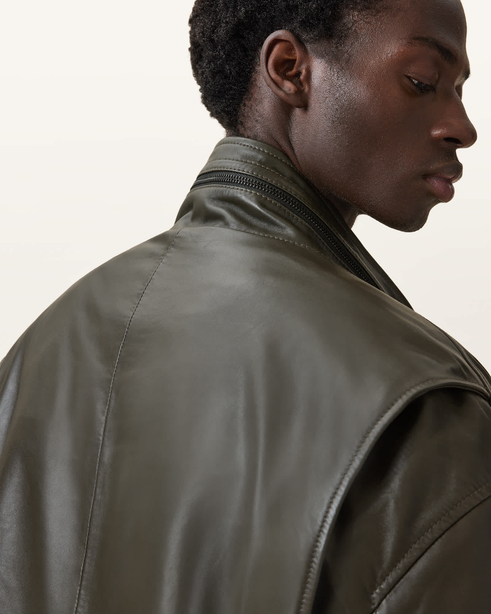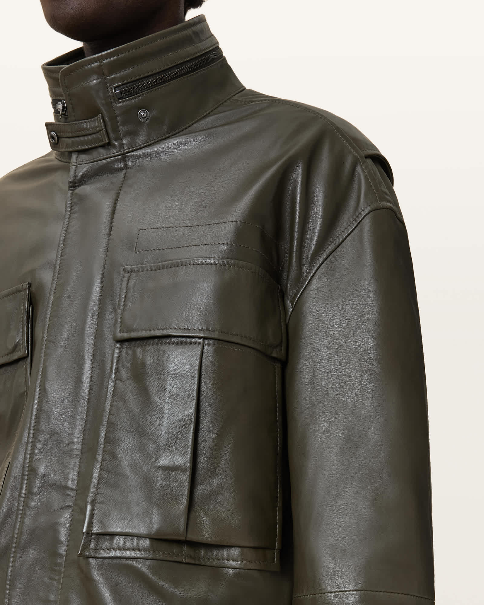 AllSaints Halton Funnel Collar Leather Jacket,, Military Green | ricciano CANADA