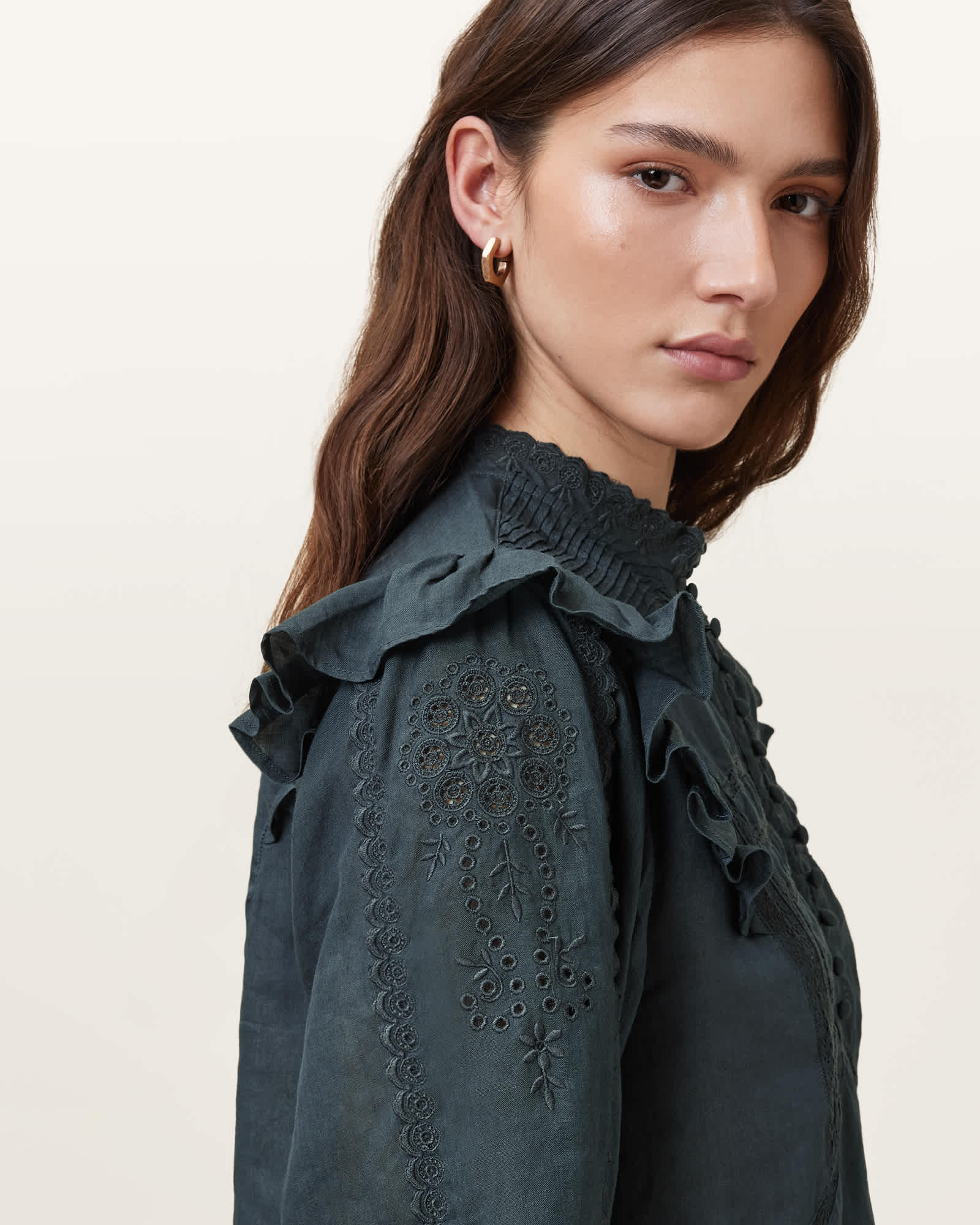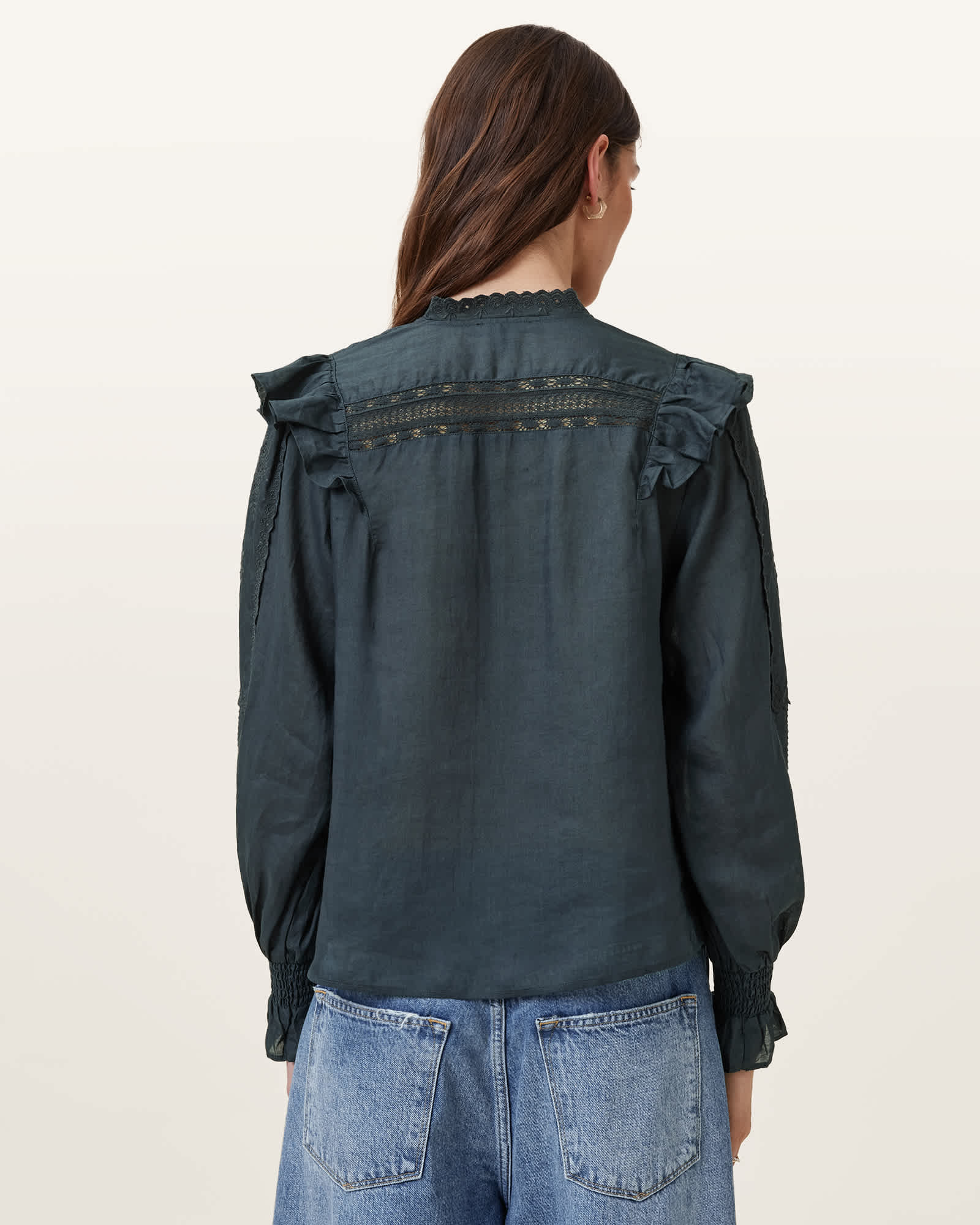 This top is designed to a relaxed fit Button closure Collar Long sleeves Elasticated cuffs Pintuck details at front yoke Lightweight