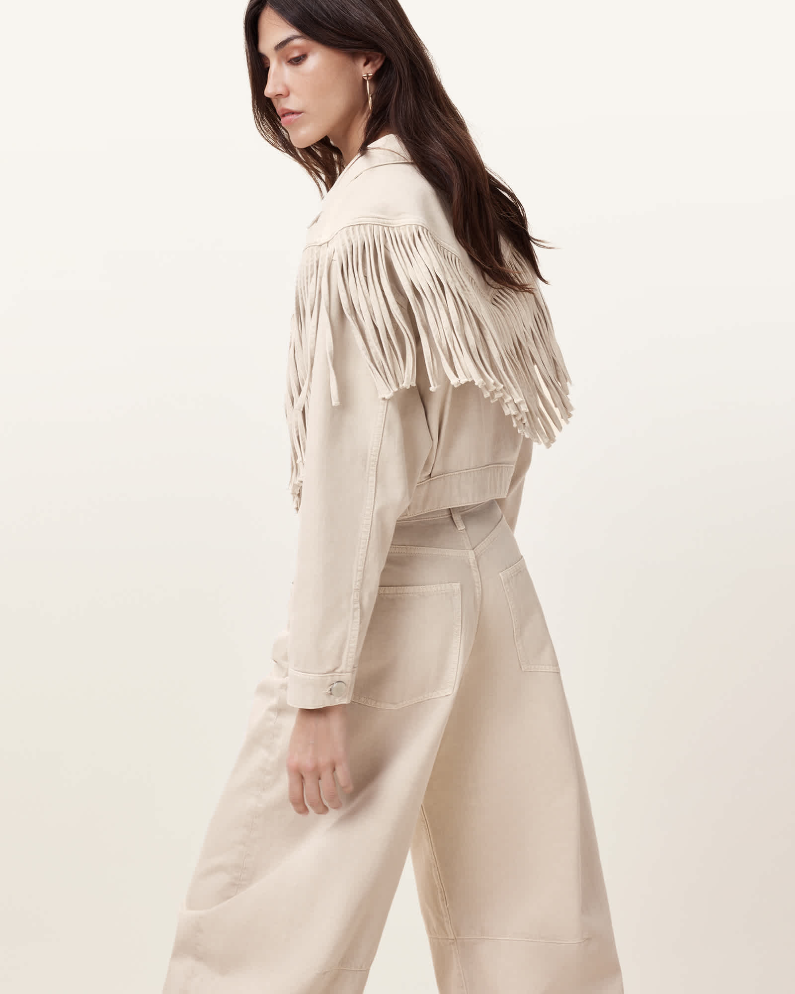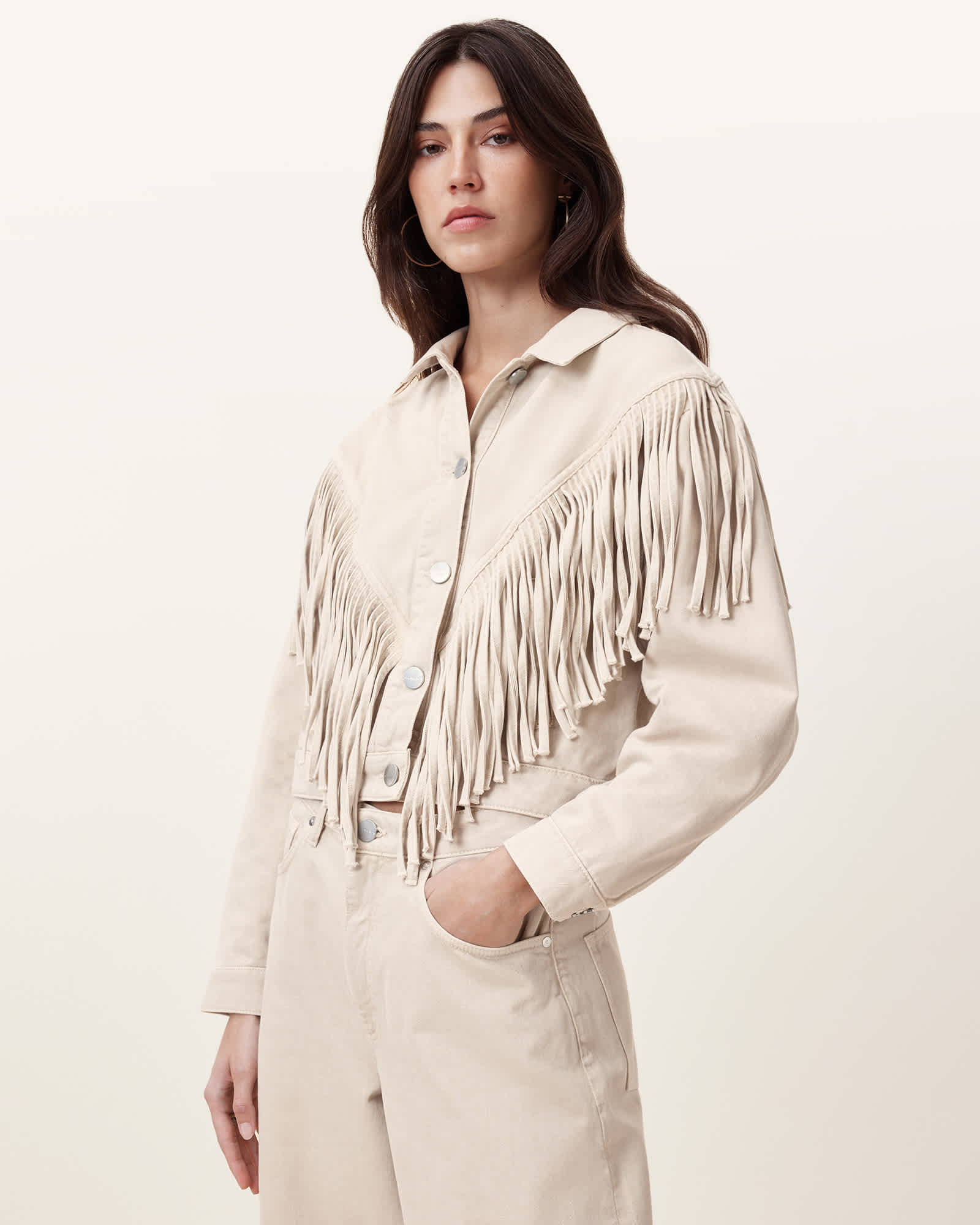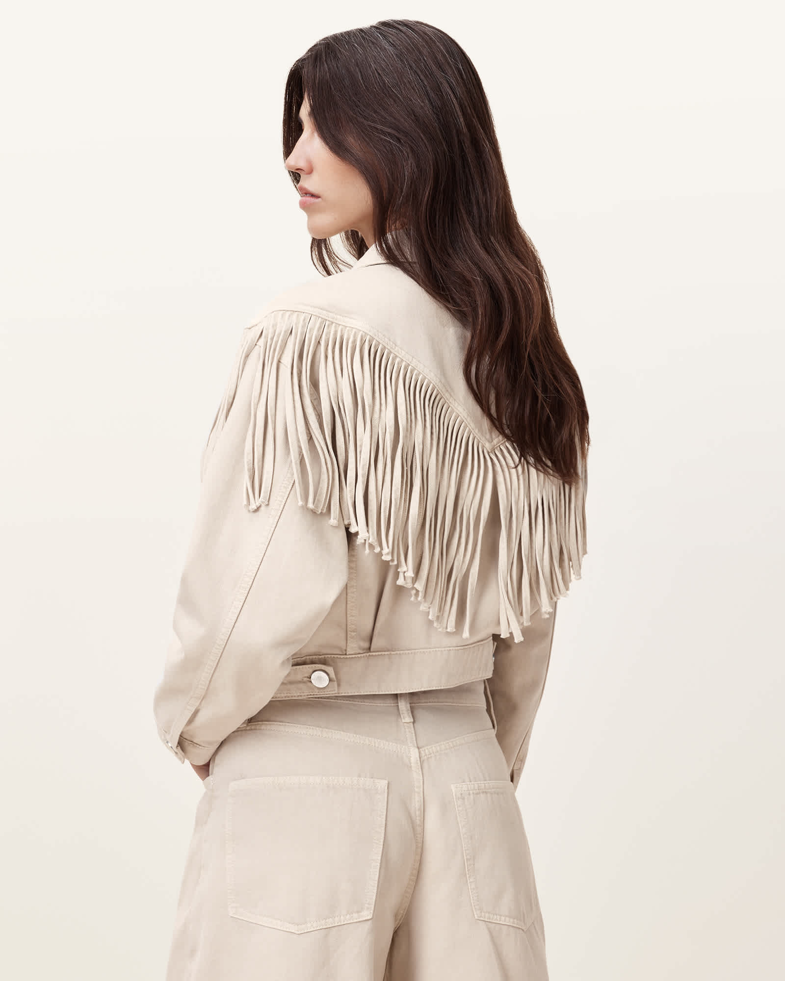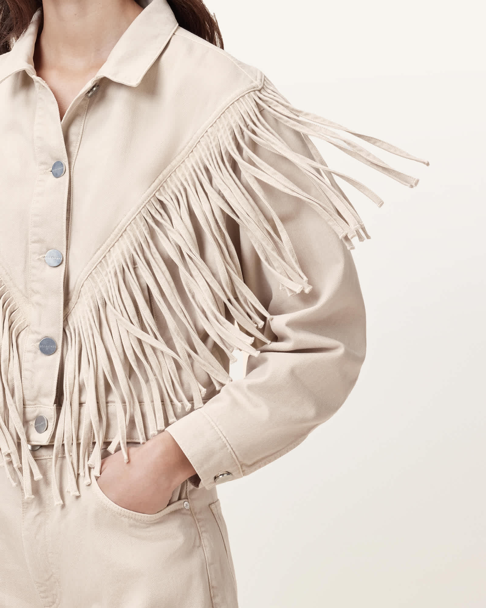 AllSaints Marlene Fringed Denim Jacket,, Cream White | ricciano CANADA