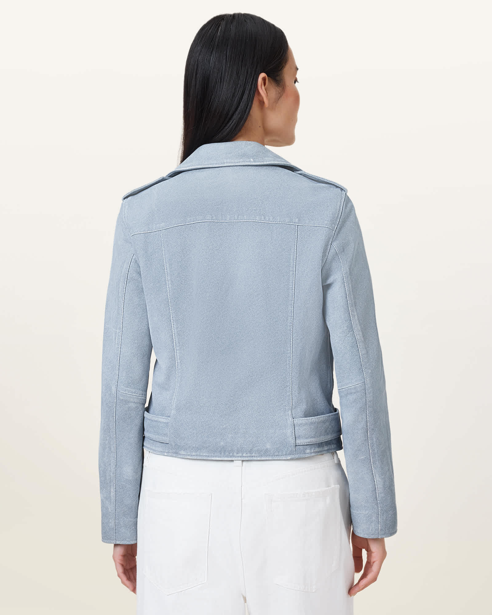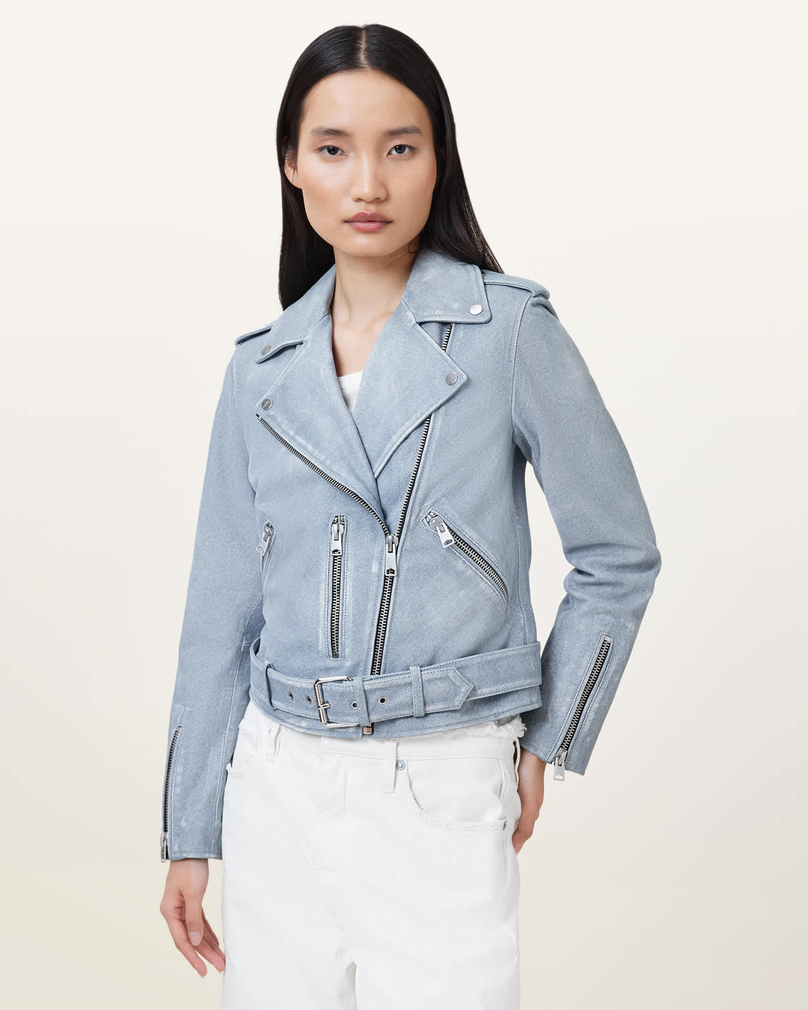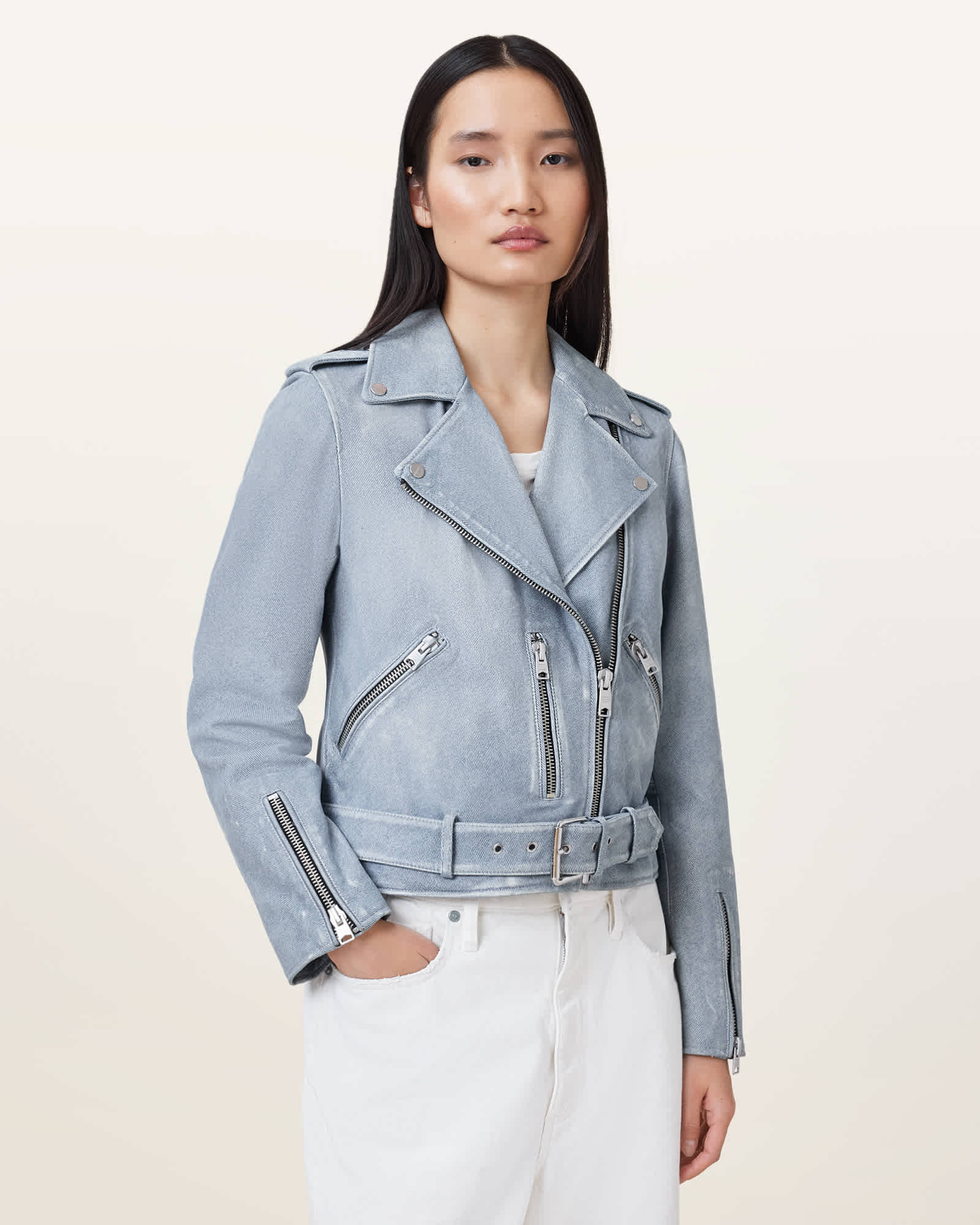 AllSaints Balfern Denim-Effect Leather Biker Jacket,, Denim Blue