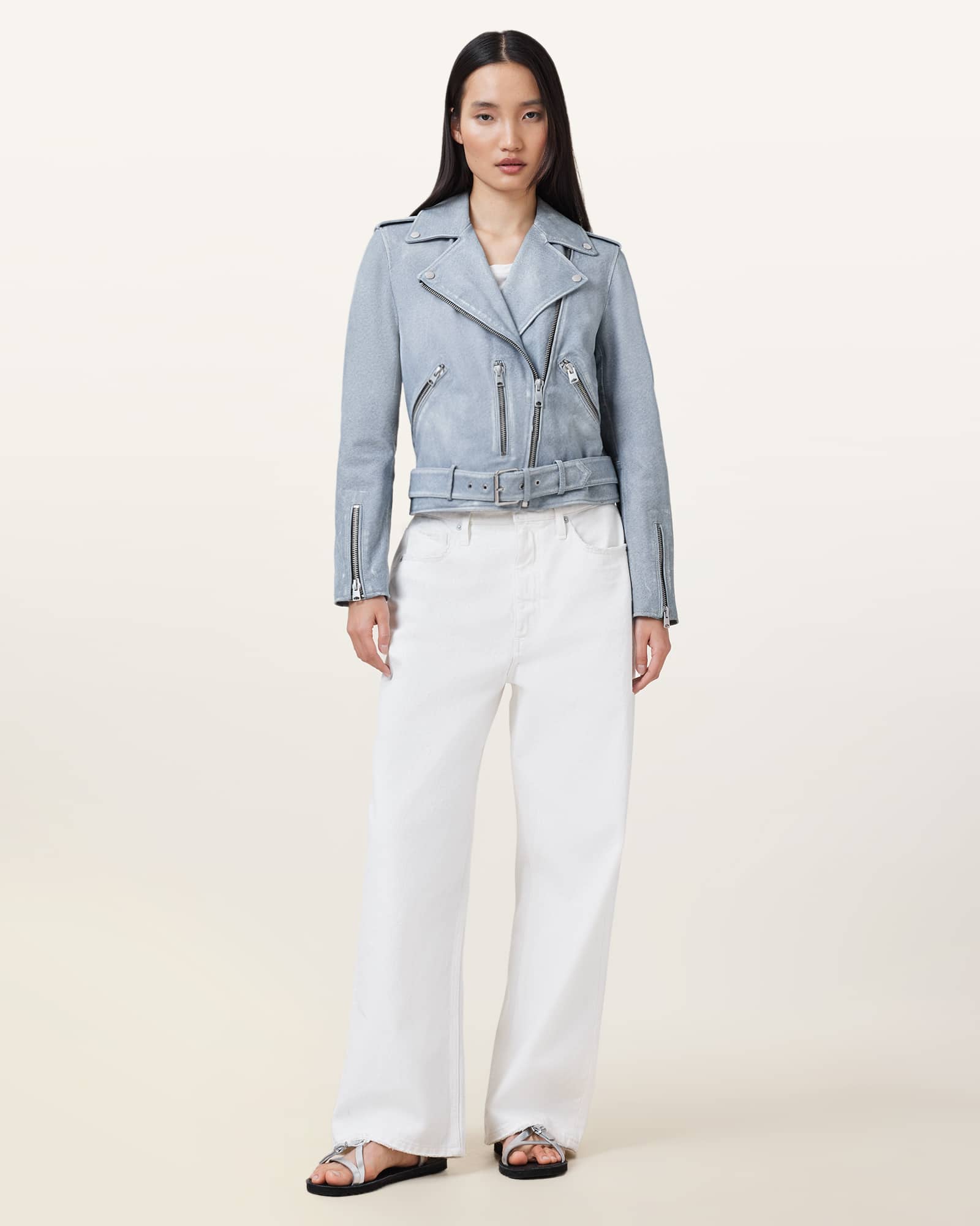 com This leather jacket is designed to a relaxed fit Long sleeves Metal hardware Three lower zip pockets Fully lined Belted hem with roller buckle fastening Bracelet length sleeves Zip cuff detail Epaulette shoulder detail with popper fastening